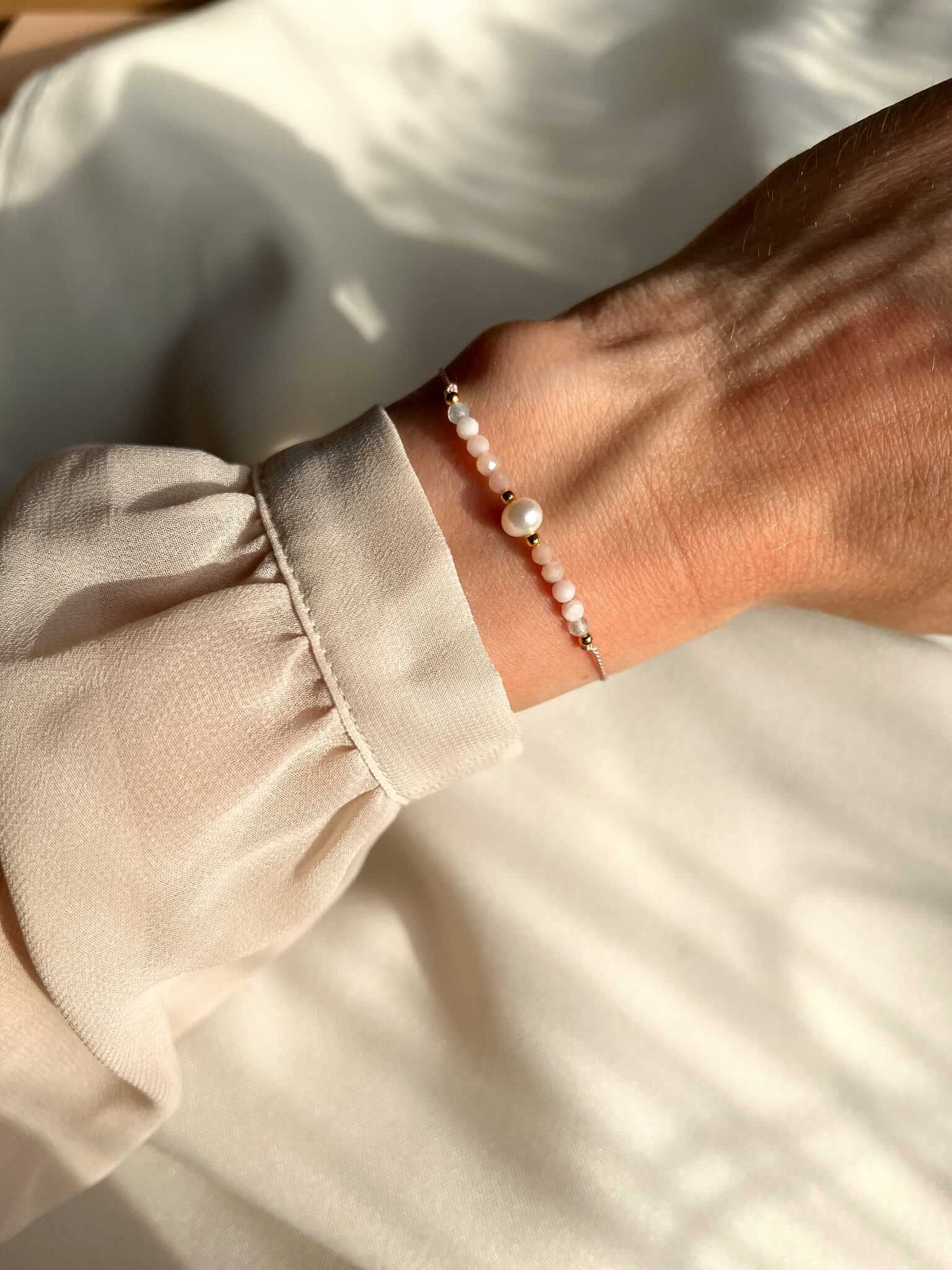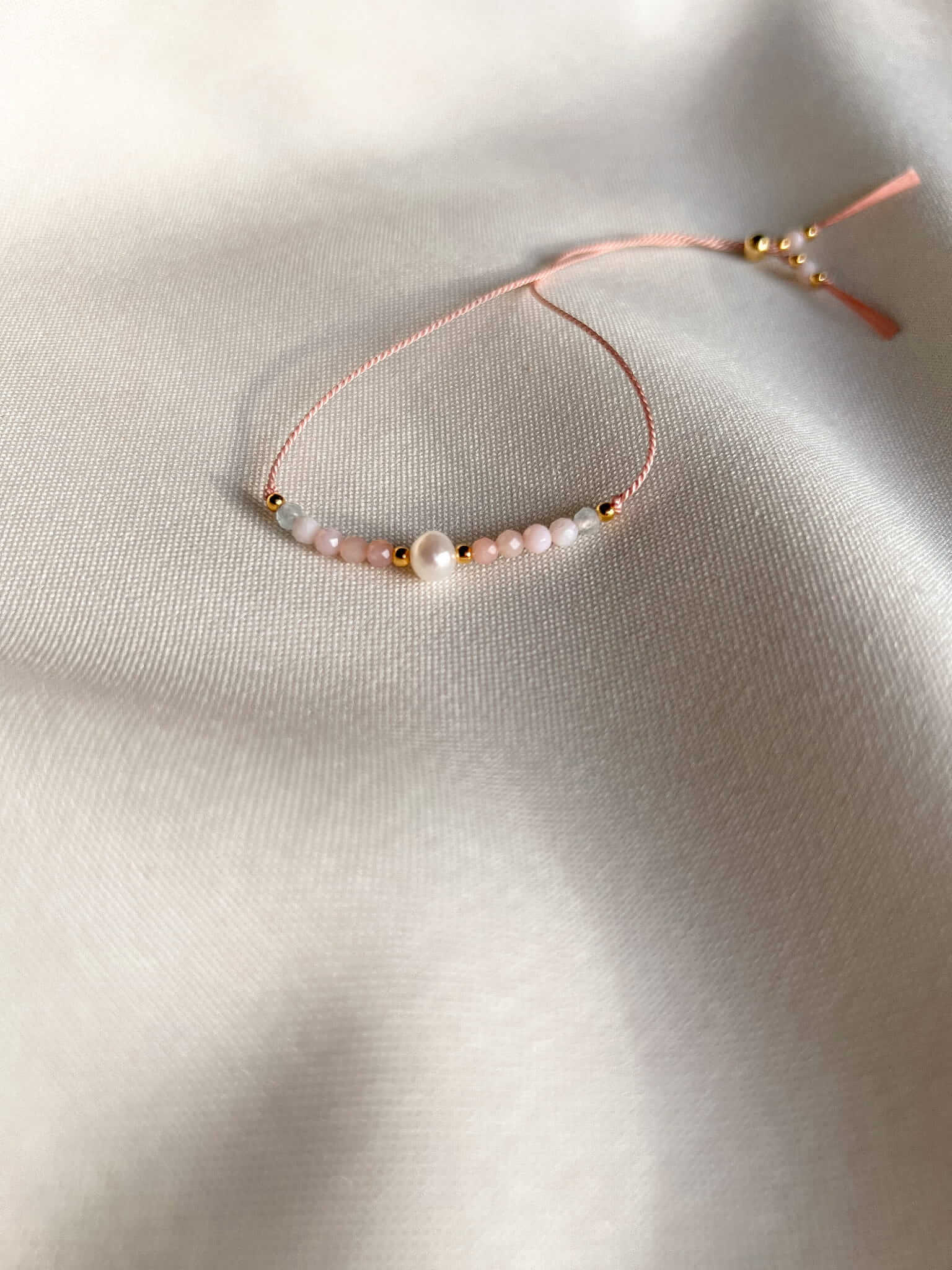Opal w towarzystwie akwamarynu i srebrnych kuleczek pozłacanymi 24-karatowym złotem. Całość nawleczona na bladoróżową nić jedwabną, regulowaną (do 24cm) srebrnym, pozłacanym stoperem, który zapewnia możliwość dopasowanie bransoletki idealnie do każdego nadgarstka.