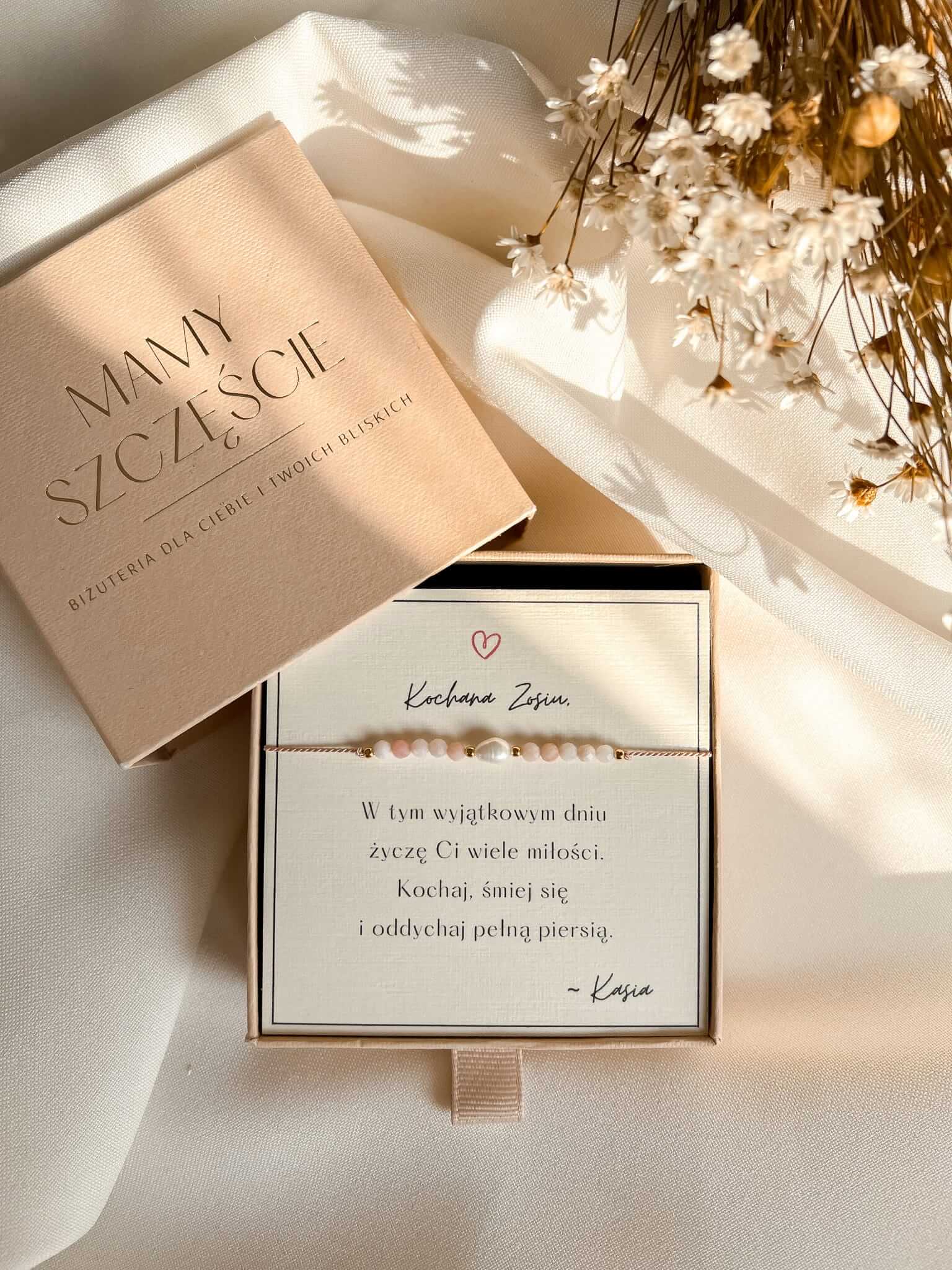 Subtelna bransoletka na prezent urodzinowy dla miłośniczki pudrowych kolorów. Dołącz do niej Twoją osobistą dedykację, a Twój prezent zachwyci obdarowaną osobę.
