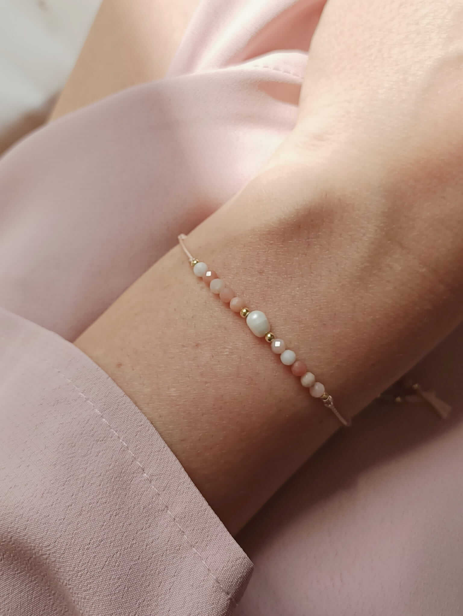 Naturalna perła w otoczeniu opali i srebrnych kuleczek pozłacanymi 24-karatowym złotem. Całość nawleczona na bladoróżową nić jedwabną, regulowaną (do 24cm) srebrnym, pozłacanym stoperem, który zapewnia możliwość dopasowanie bransoletki idealnie do każdego nadgarstka.
