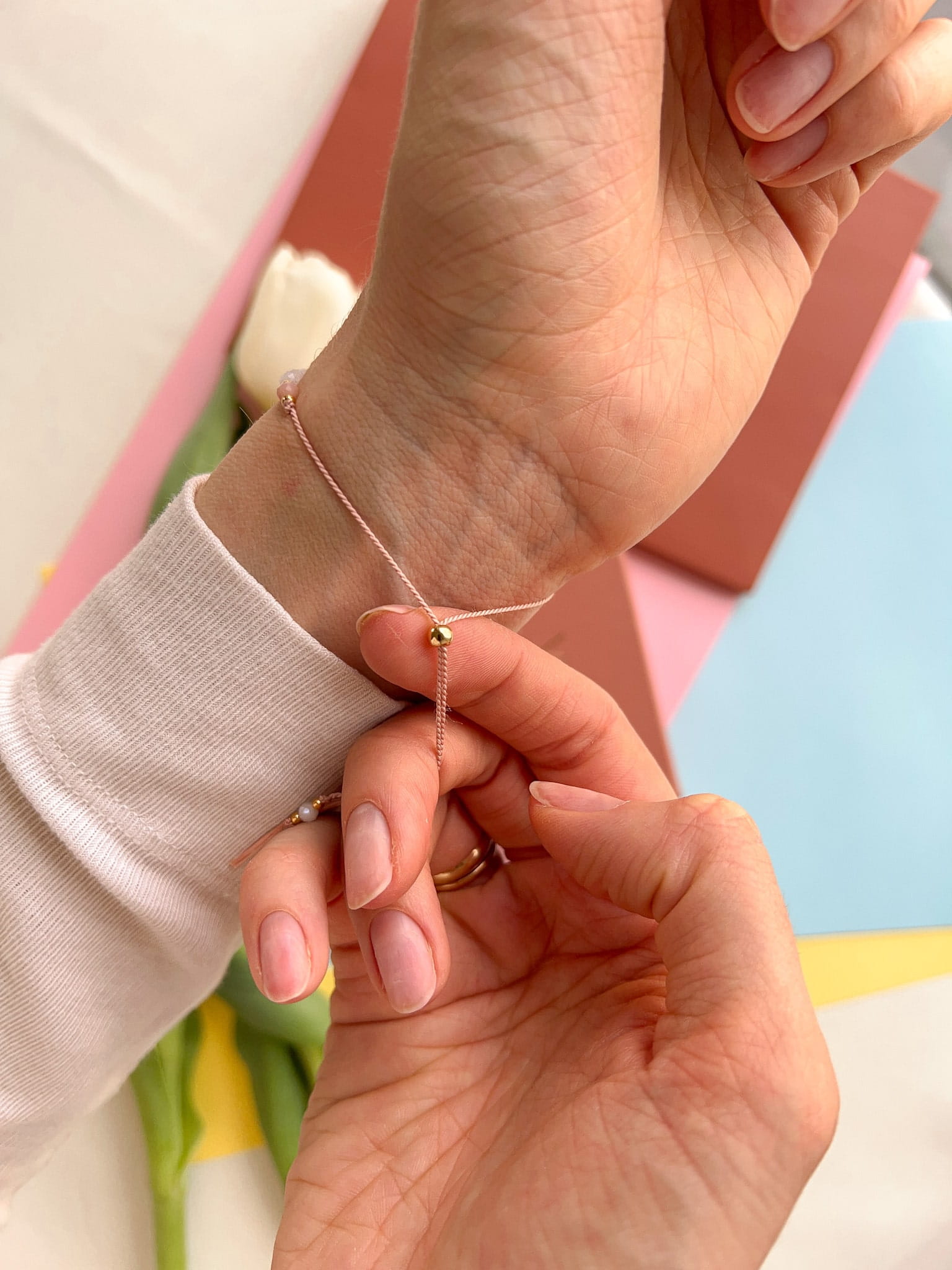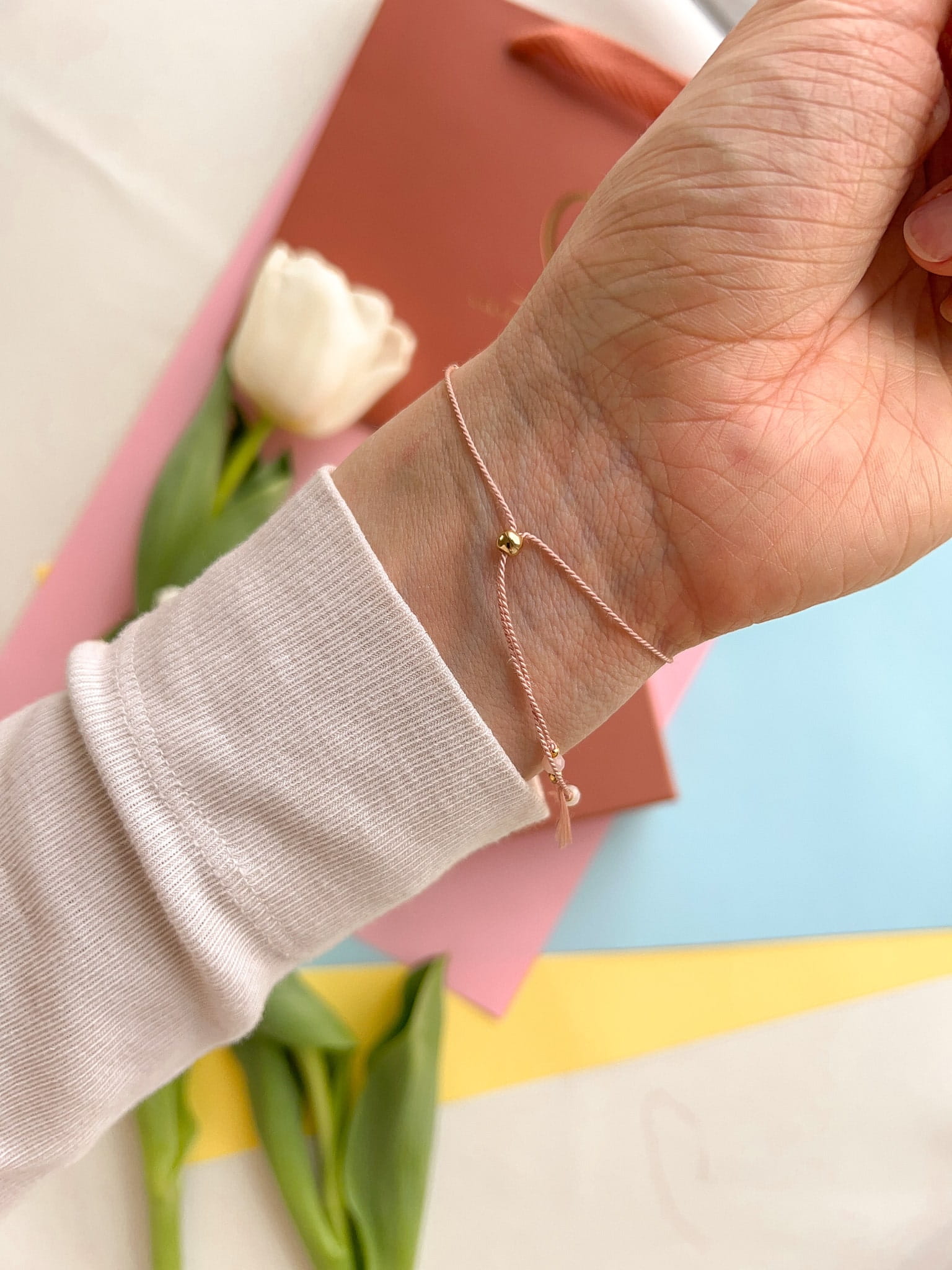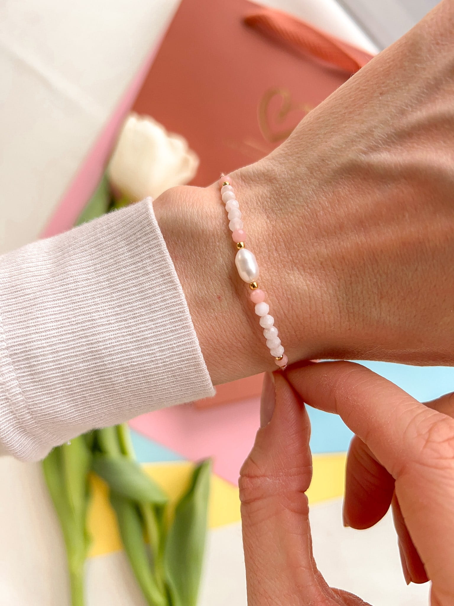 Bransoletka Bridge to słodkowodna perła w otoczeniu jasnoróżowych opali i kuleczek wykonanych z pozłacanego srebra próby 925. Całość nawleczona na jedwabną nić w kolorze pudrowego różu. Każda bransoletka na nici posiada srebrny (złocony) stoper, który zapewnia regulację (od 6 do 24 cm) i możliwość dopasowanie bransoletki idealnie do każdego nadgarstka.