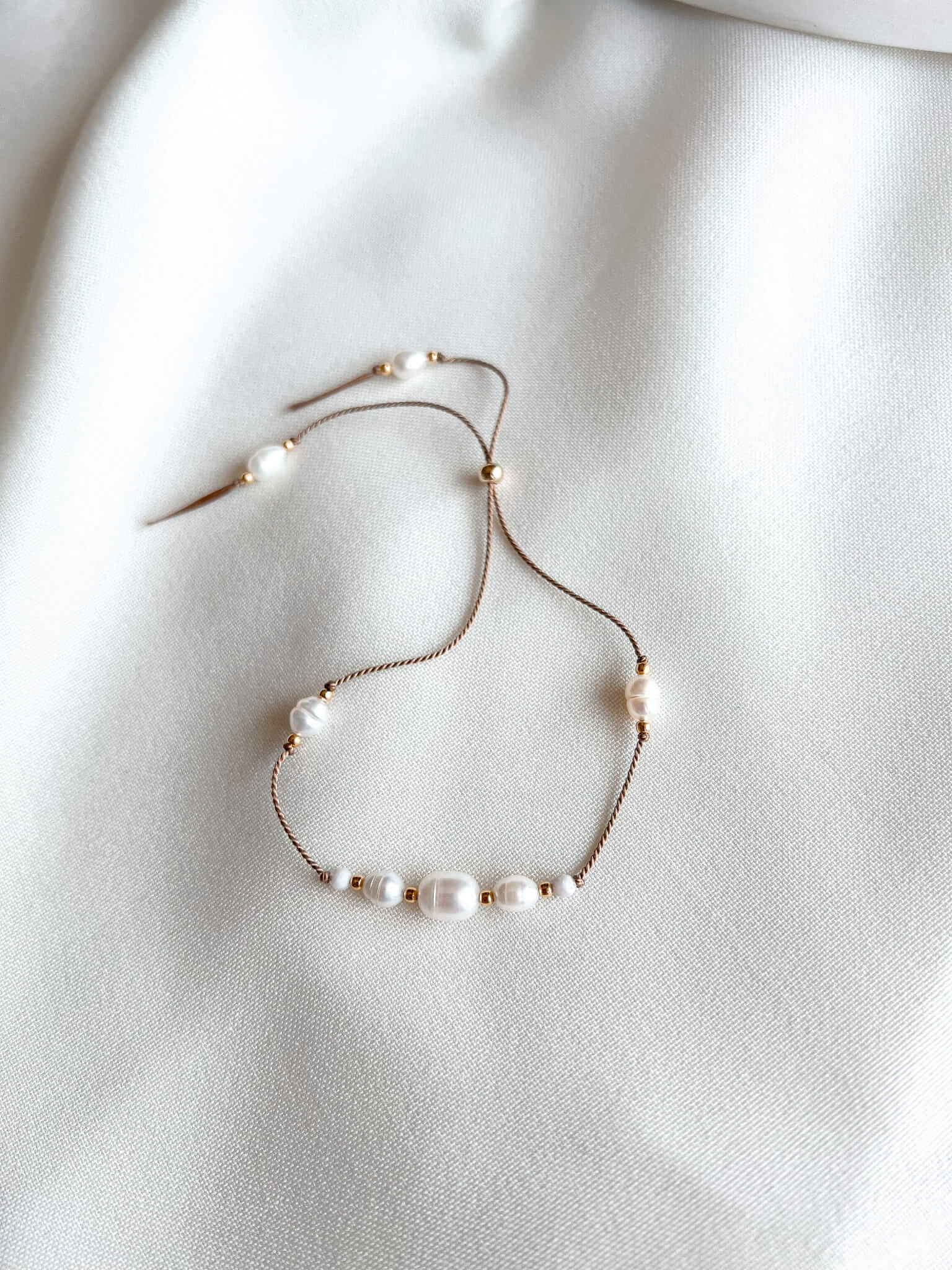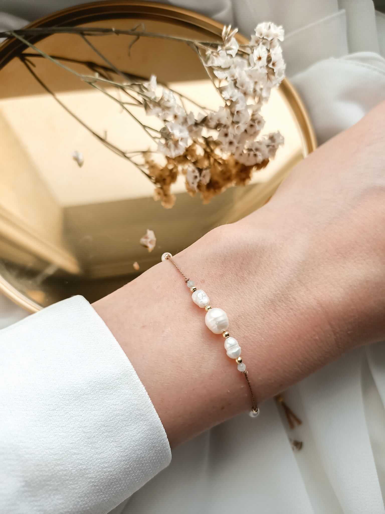 Naturalne perły słodkowodne, w towarzystwie srebrnych kuleczek pozłacanymi 24-karatowym złotem. Całość nawleczona na beżową nić jedwabną, regulowaną (do 24cm) srebrnym, pozłacanym stoperem, który zapewnia możliwość dopasowanie bransoletki idealnie do każdego nadgarstka.