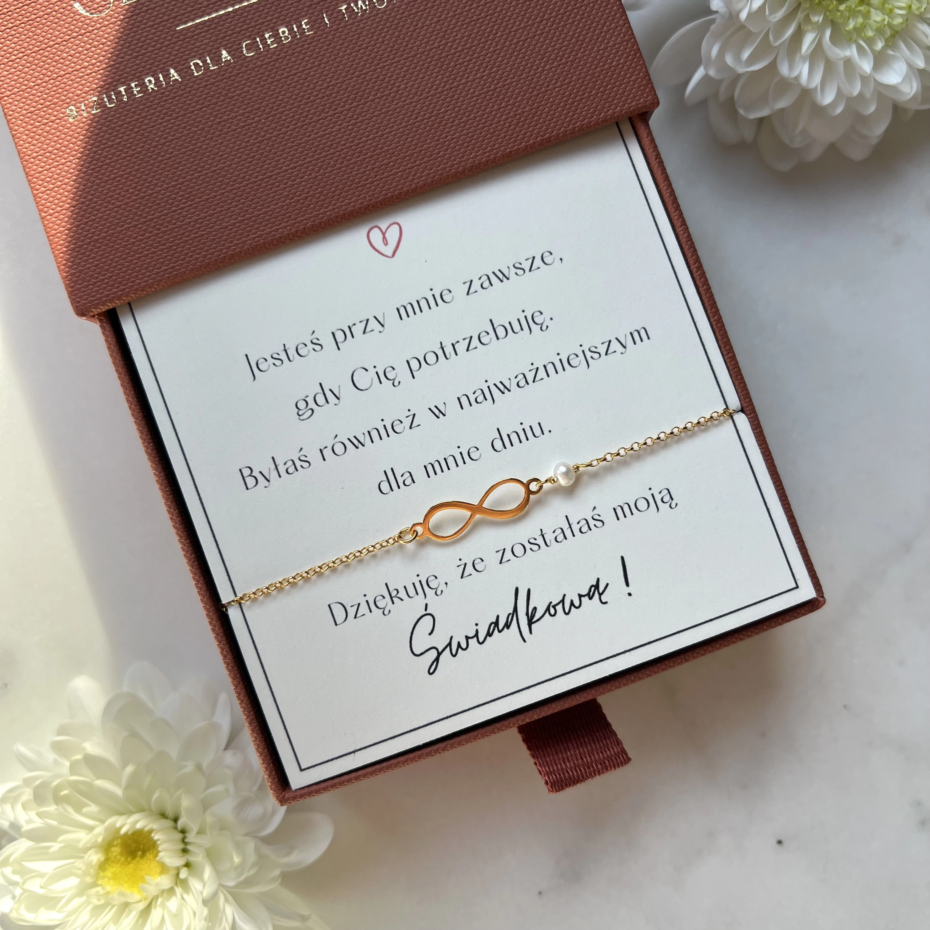 Bransoletka Forever ze znakiem nieskończoności i perłą, srebrna pozłacana 25-k I Prezent na podziękowanie dla świadkowej