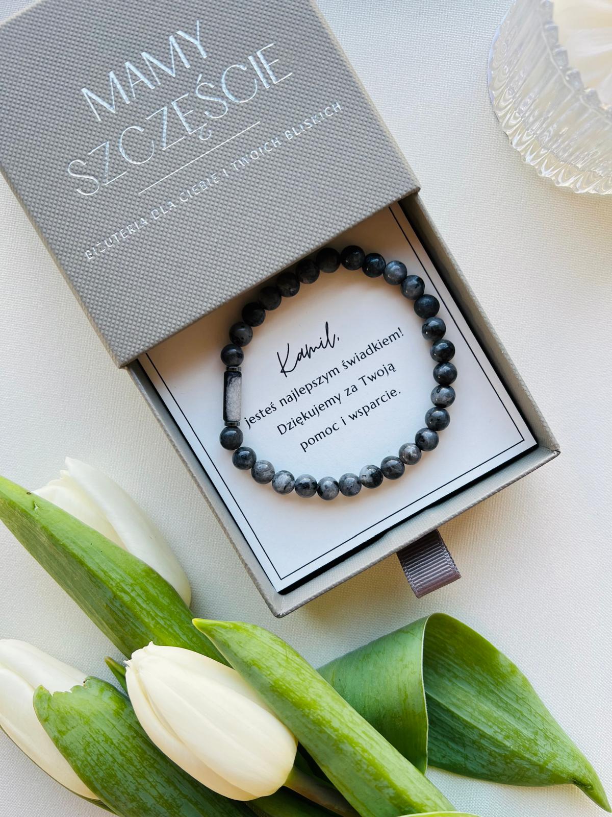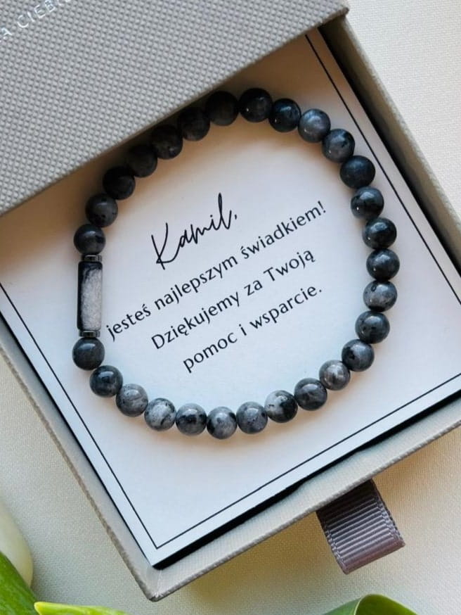 Nasza biżuteria jest wykonana z wysokiej jakości materiałów, co gwarantuje trwałość i niepowtarzalność każdego egzemplarza. Bransoletka Larvikit wykonana jest z kamieni jaspisu, larvikitu i hematytu, a połączona z dedykacją, z pewnością zrobi niezapomniane wrażenie na bliskiej Ci osobie.