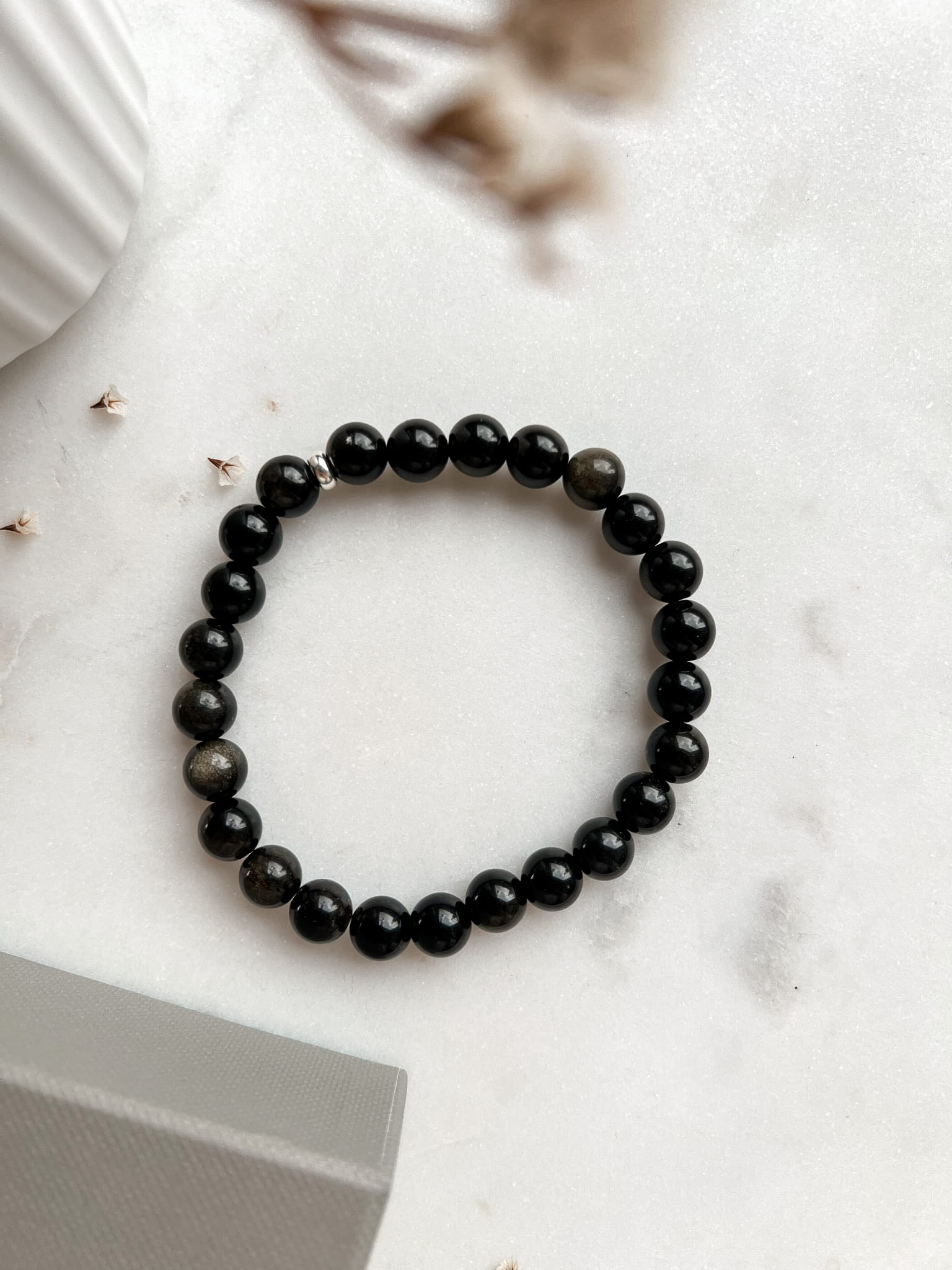 Męska bransoletka Obsydian wykonana z naturalnych kamieni obsydianu i dodatków ze srebra 925.