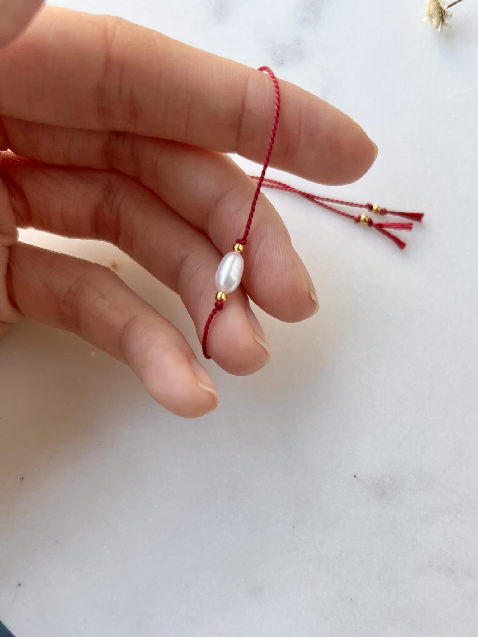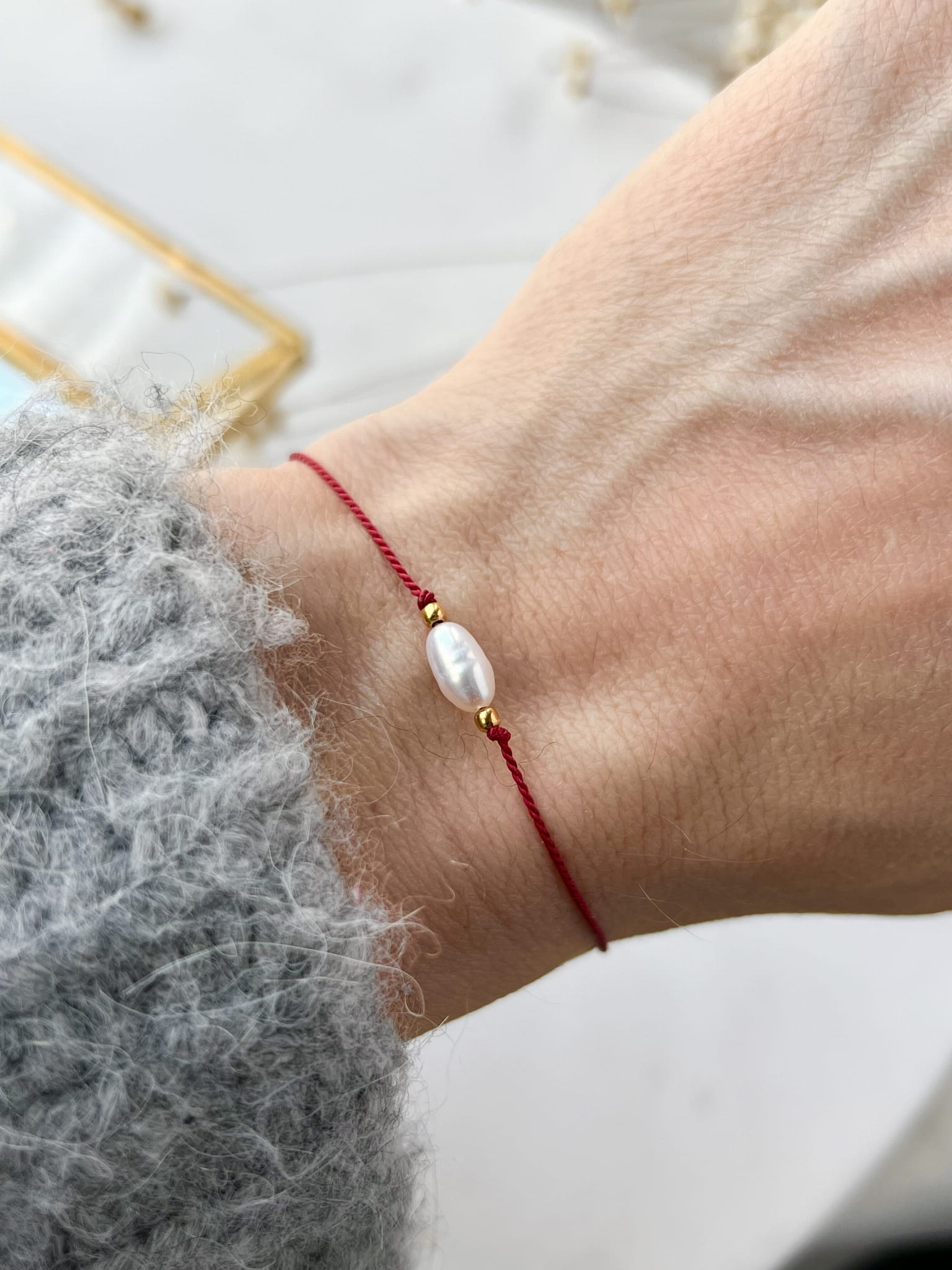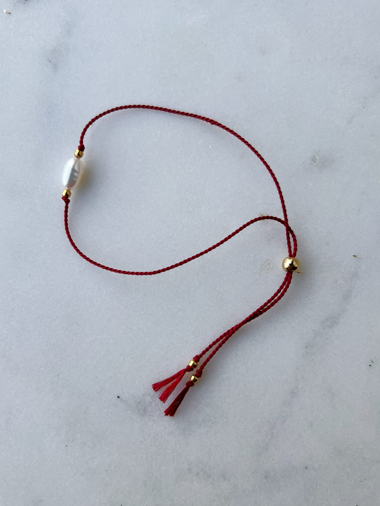bransoletka z naturalną perłą oraz srebrnymi kuleczkami, pozłacanymi 24-karatowym złotem. Całość nawleczona na czerwoną nić jedwabną, regulowana (do 24cm) stoperem, który zapewnia możliwość dopasowanie bransoletki idealnie do każdego nadgarstka.