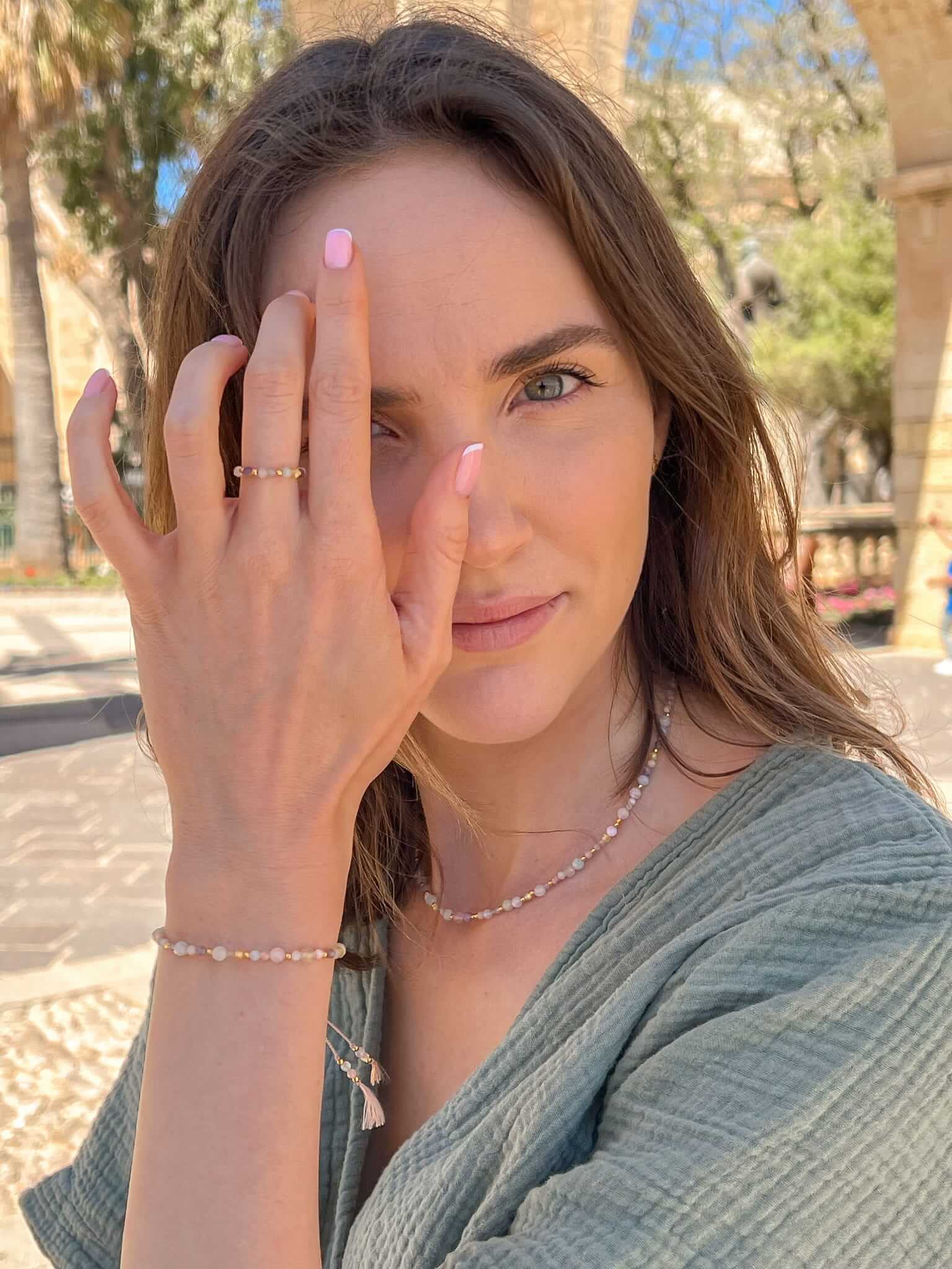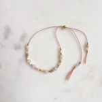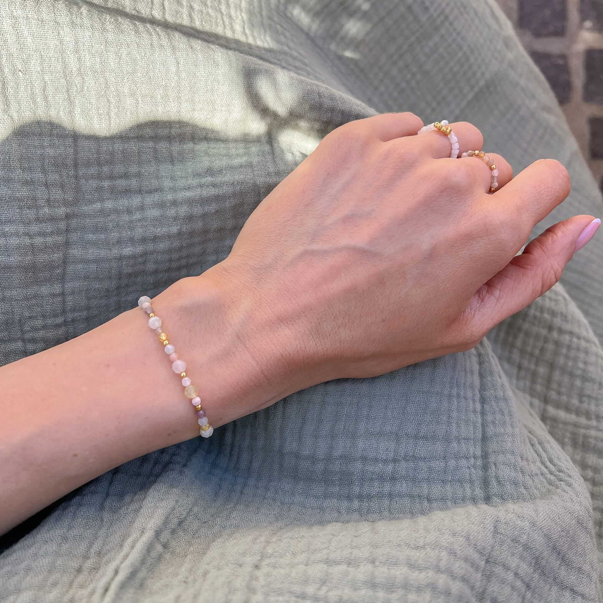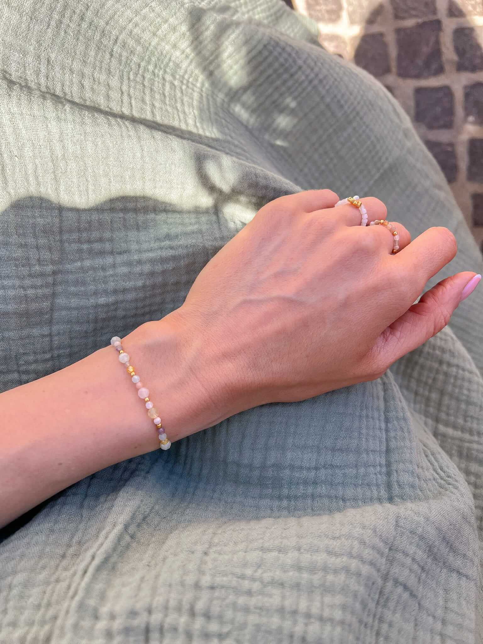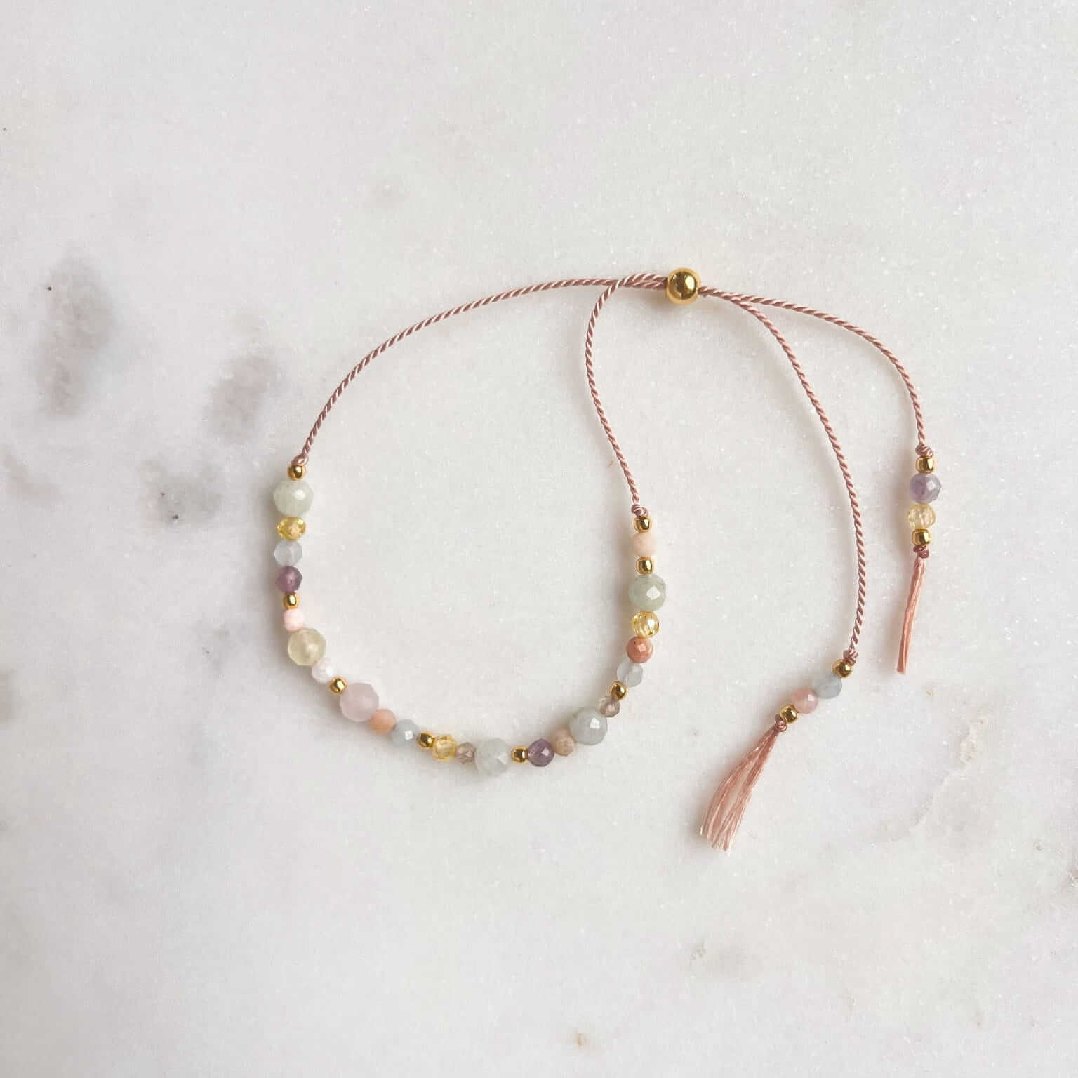 Naturalne kamienie pudrowych morganitu, różowych opali, żółtych cyrkoni cytrynowych, fioletowych ametystów, błękitnych akwamarynów i srebrnych kuleczek pozłacanymi 24-karatowym złotem. Całość nawleczona na pudroworóżową nić jedwabną, regulowaną (do 24cm) srebrnym, pozłacanym stoperem, który zapewnia możliwość dopasowanie bransoletki idealnie do każdego nadgarstka.