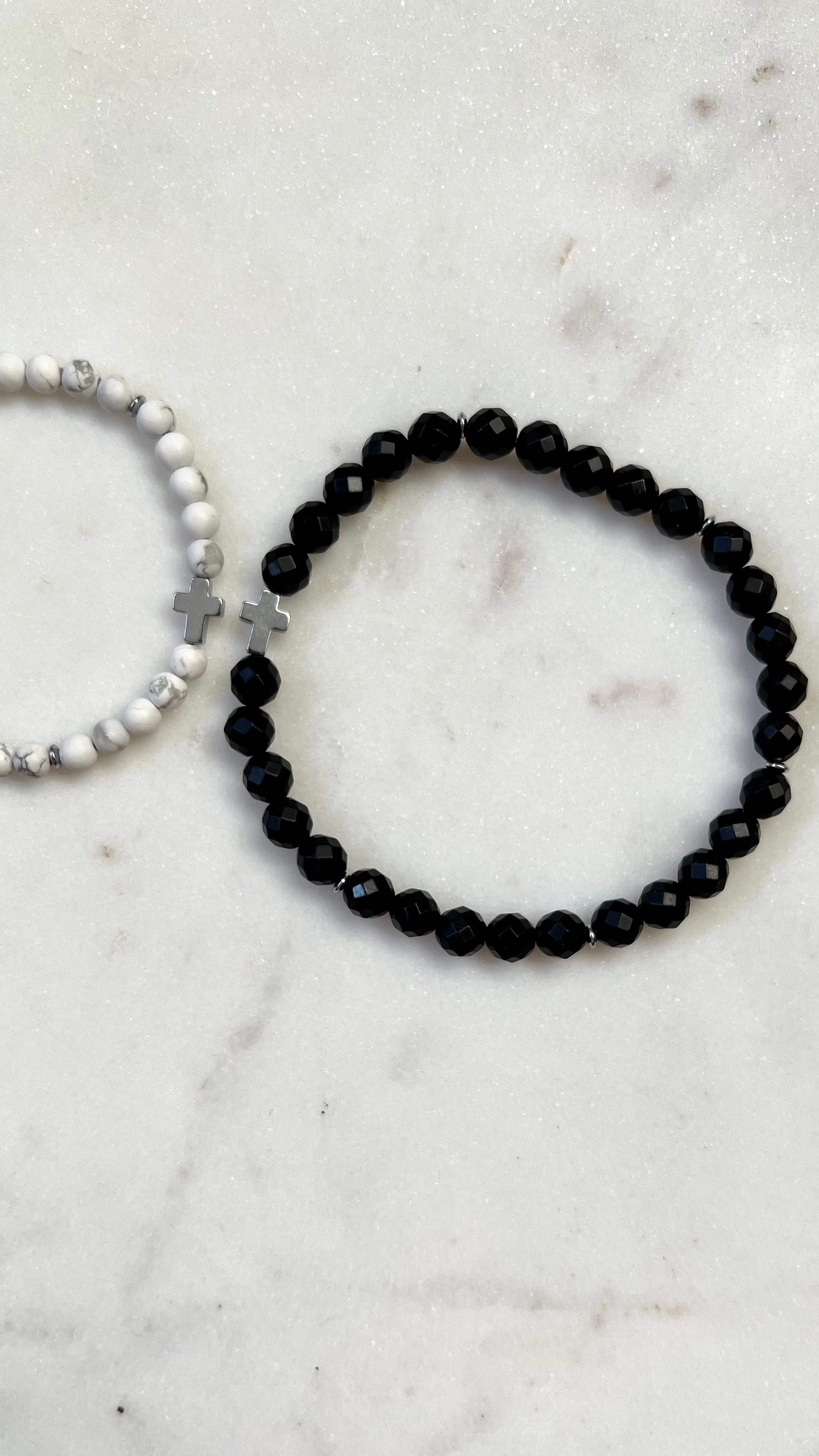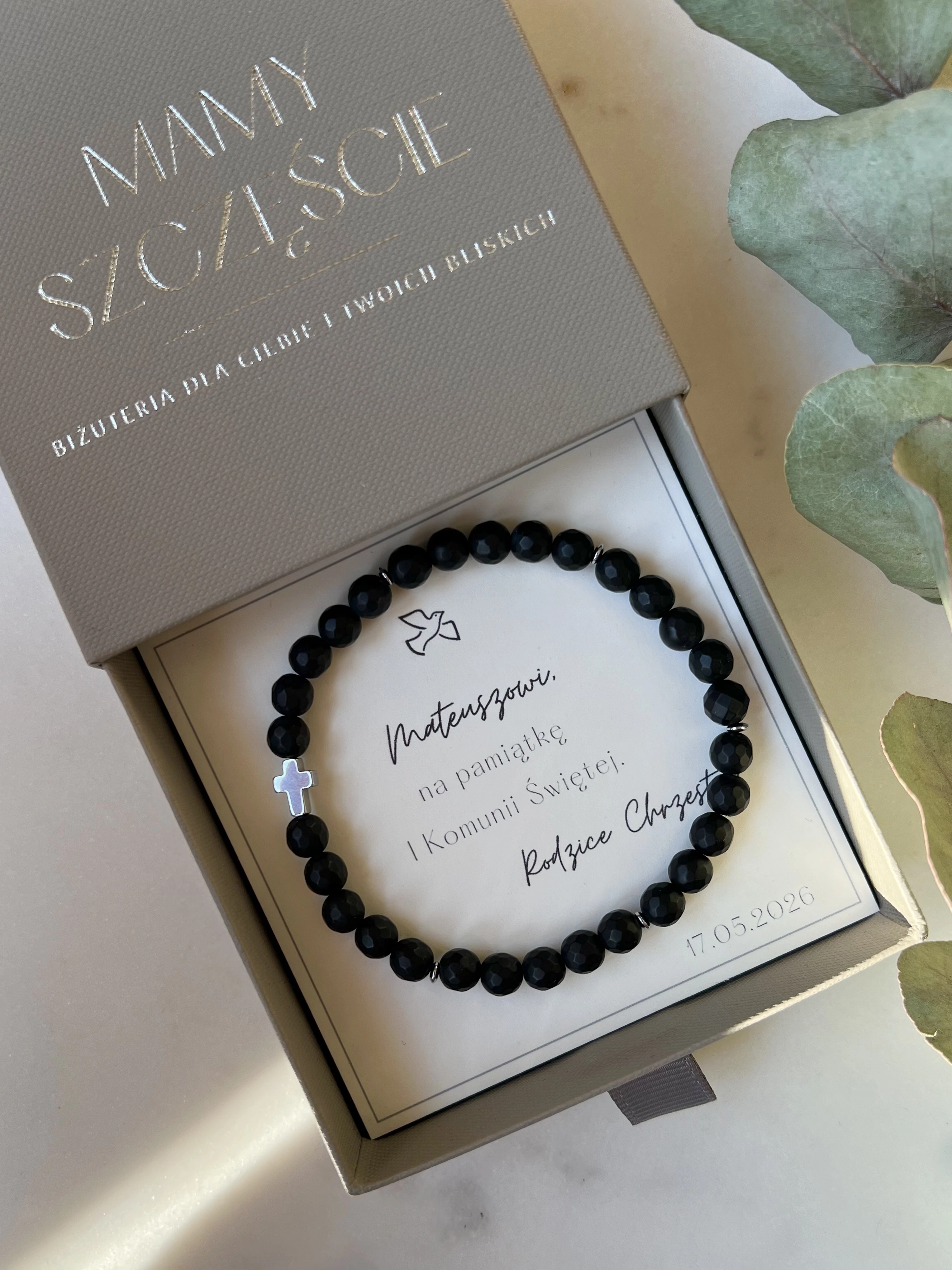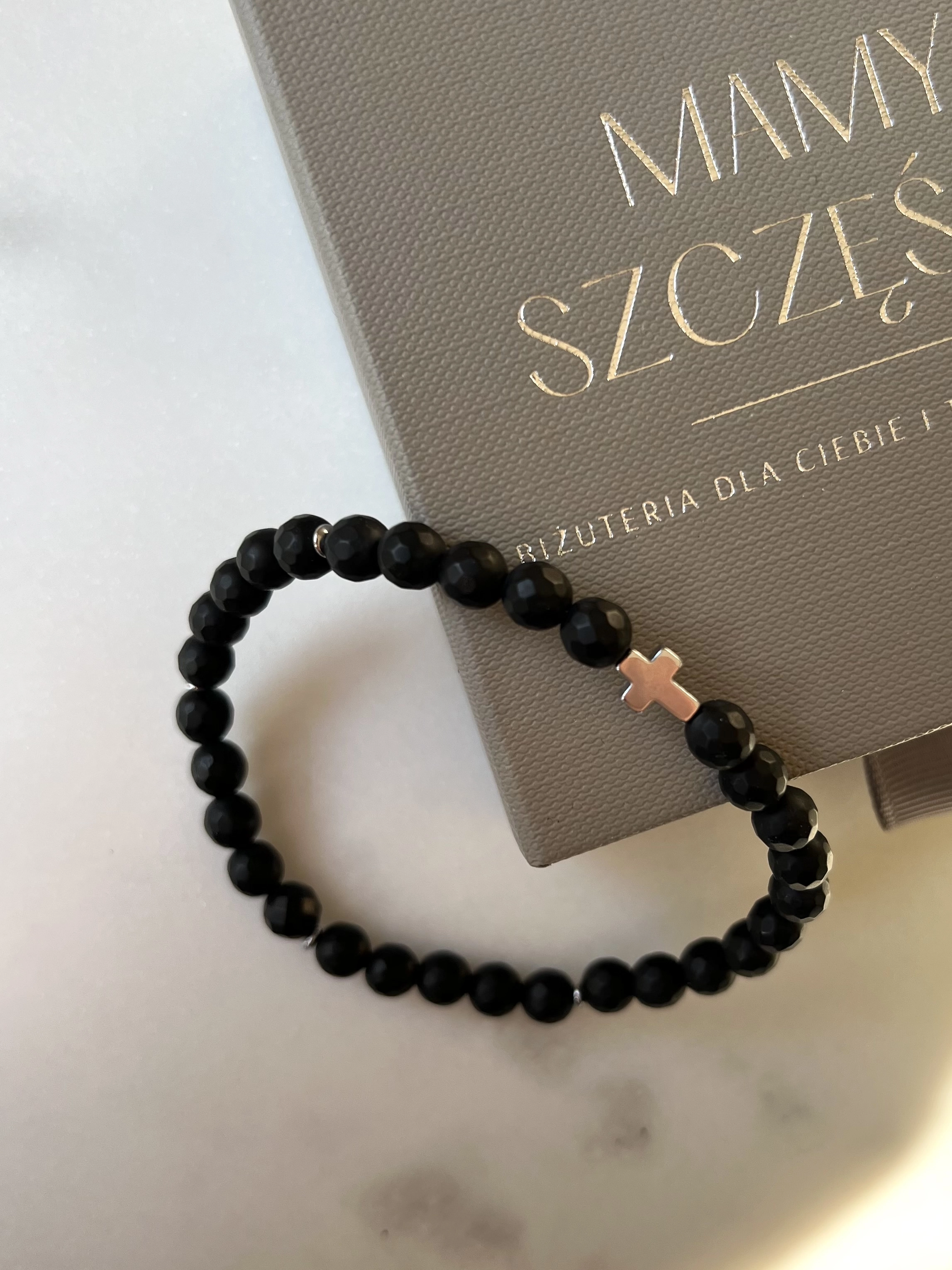 Wykonana z naturalnych kamieni onyksu z symbolicznym, minimalistycznym krzyżykiem.