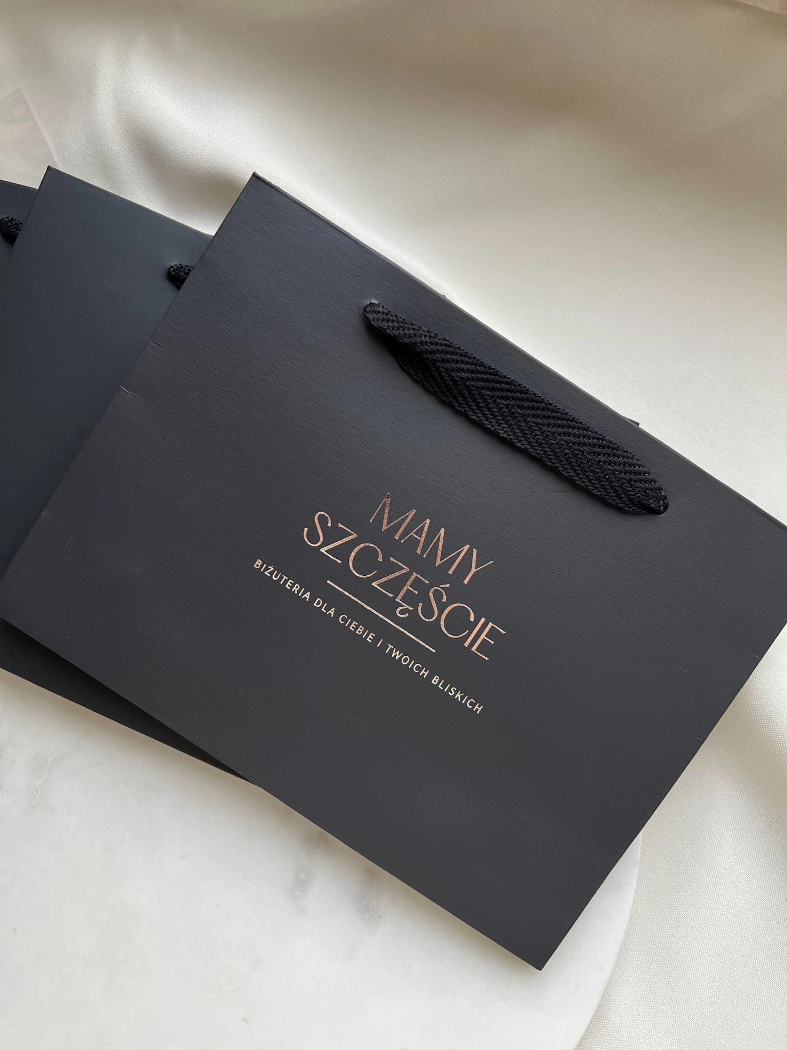 Biżuteria pakowana jest w estetyczne i ekologiczne (certyfikat FSC) pudełko jubilerskie widoczne na zdjęciu powyżej. Dobierz torebkę prezentową, a prezent będzie gotowy do wręczenia.