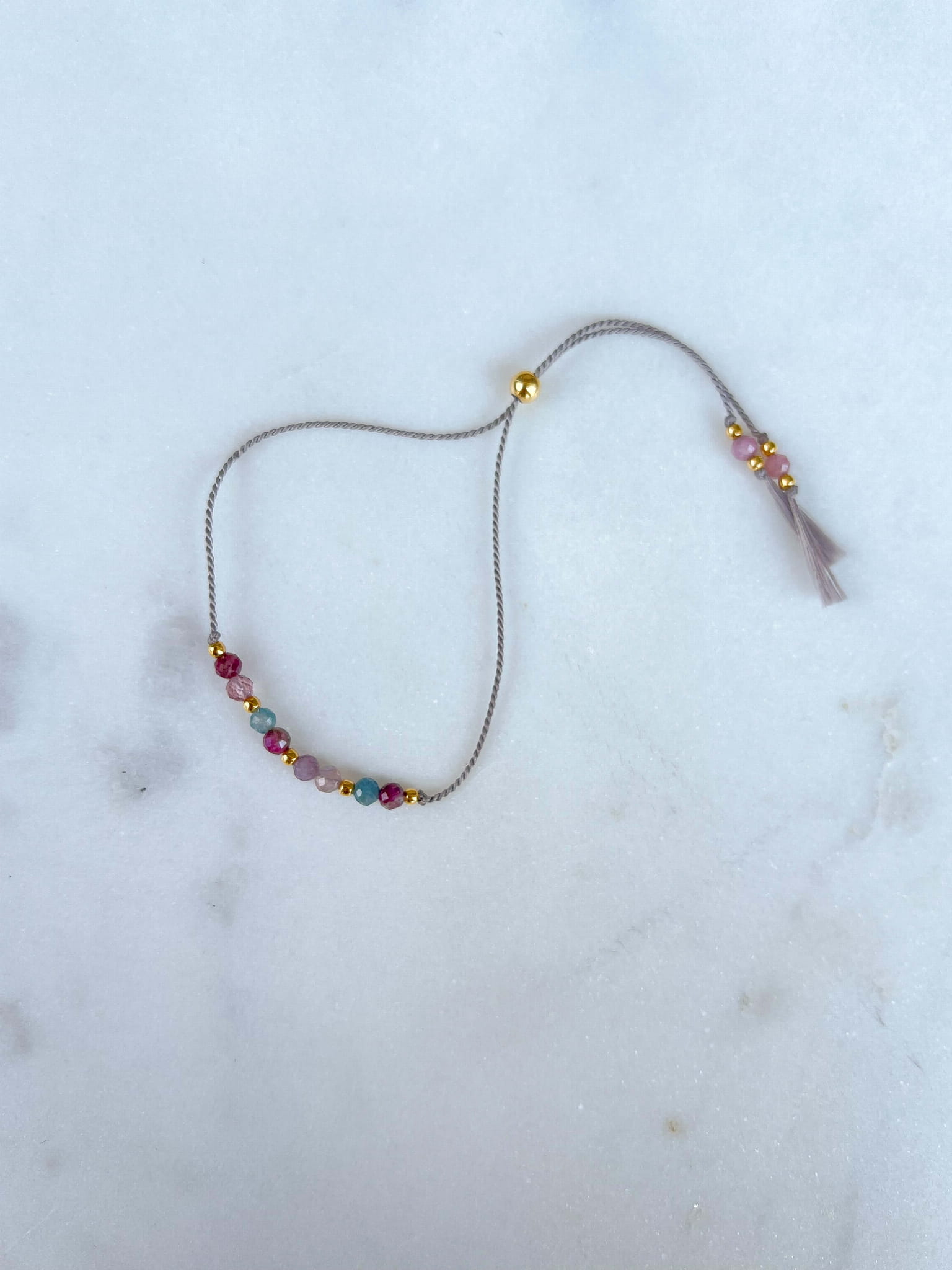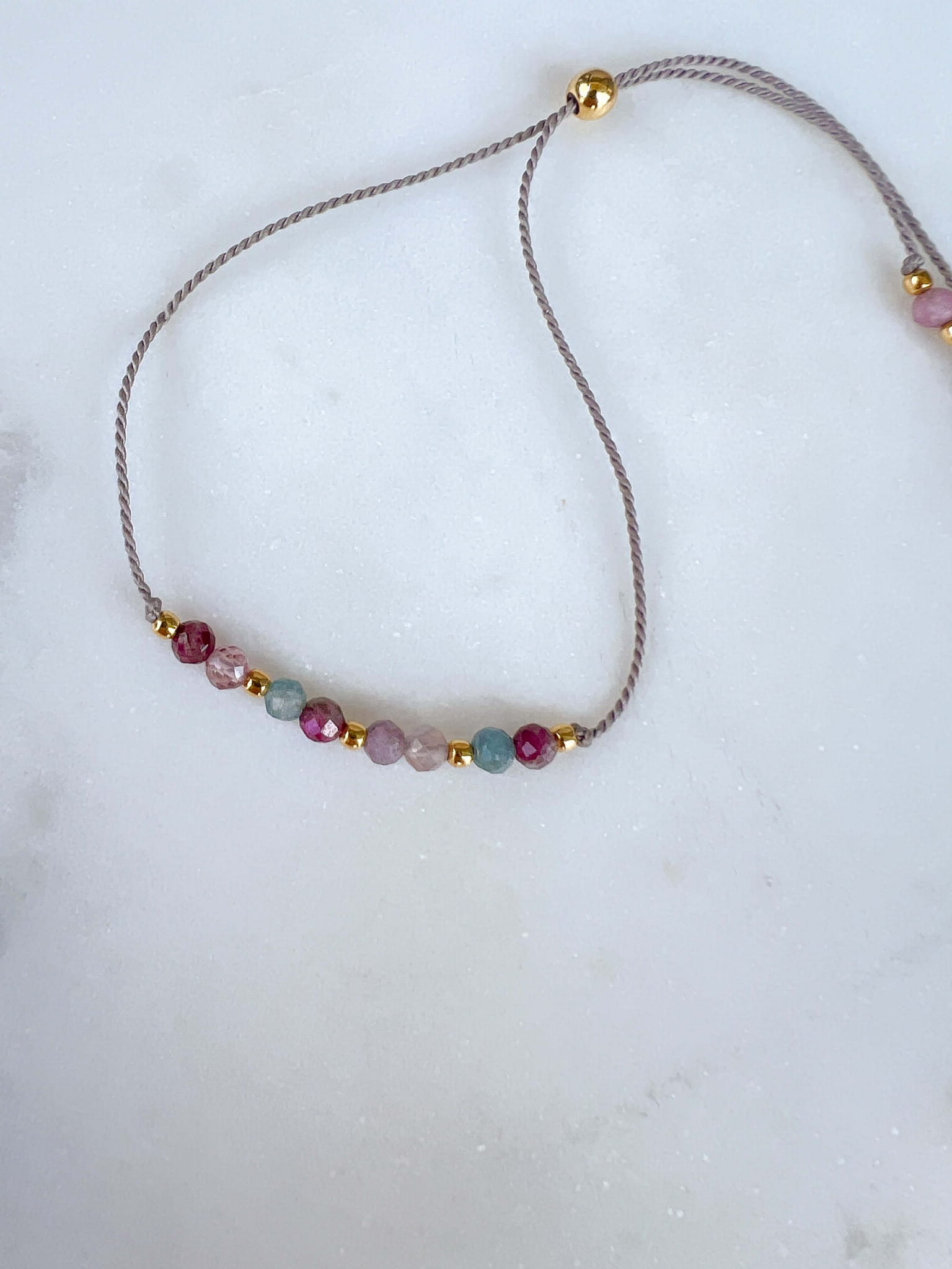 Bransoletka wykonana jest z naturalnych kamieni turmalinów, w otoczeniu srebrnych kuleczek, pozłacanych 24-karatowym złotem. Całość nawleczona na jedwabną nić w kolorze szarym. Każda bransoletka na nici posiada srebrny, pozłacany stoper, który zapewnia regulację (od 6 do 24 cm) i możliwość dopasowanie bransoletki idealnie do każdego nadgarstka.