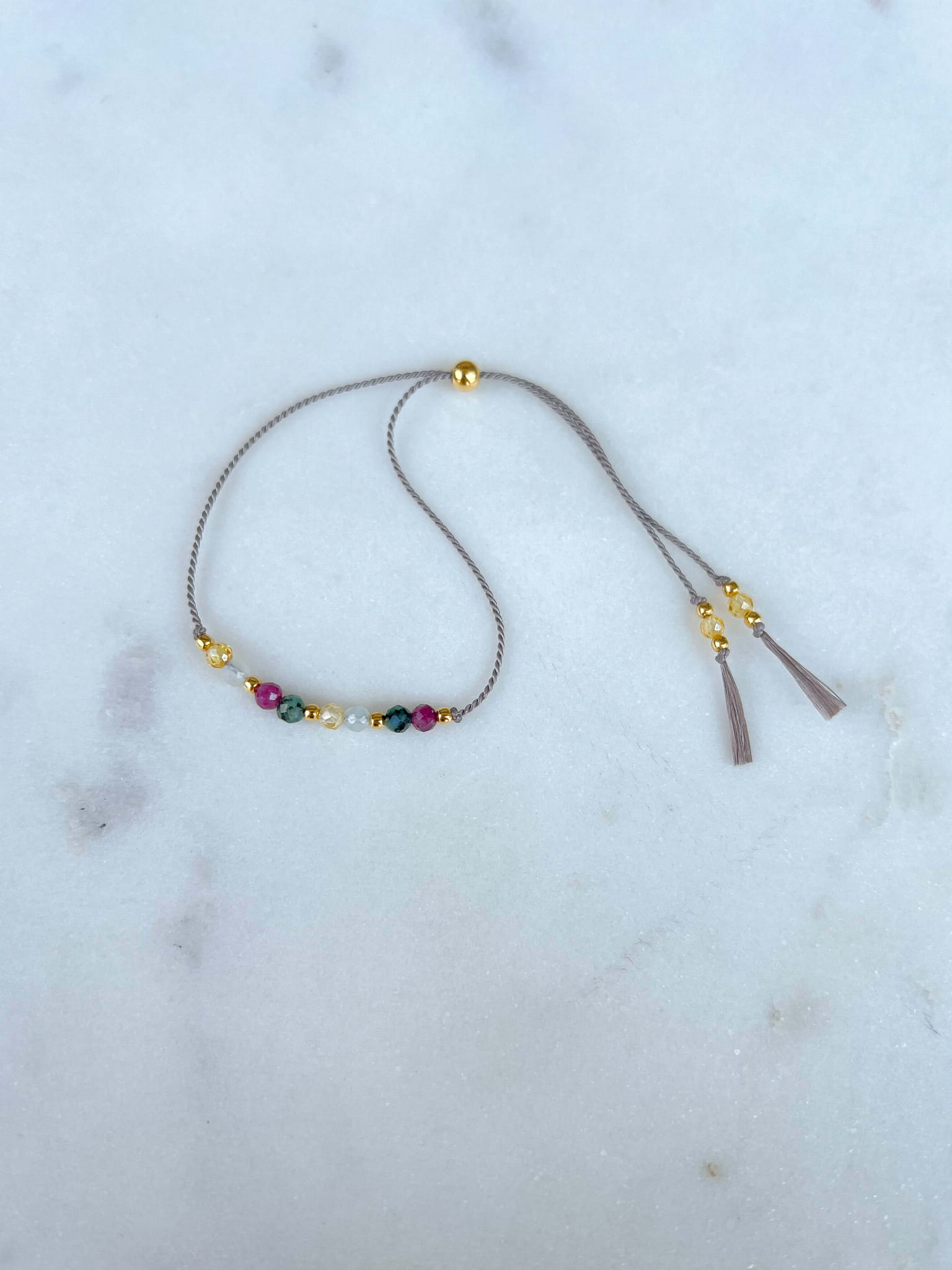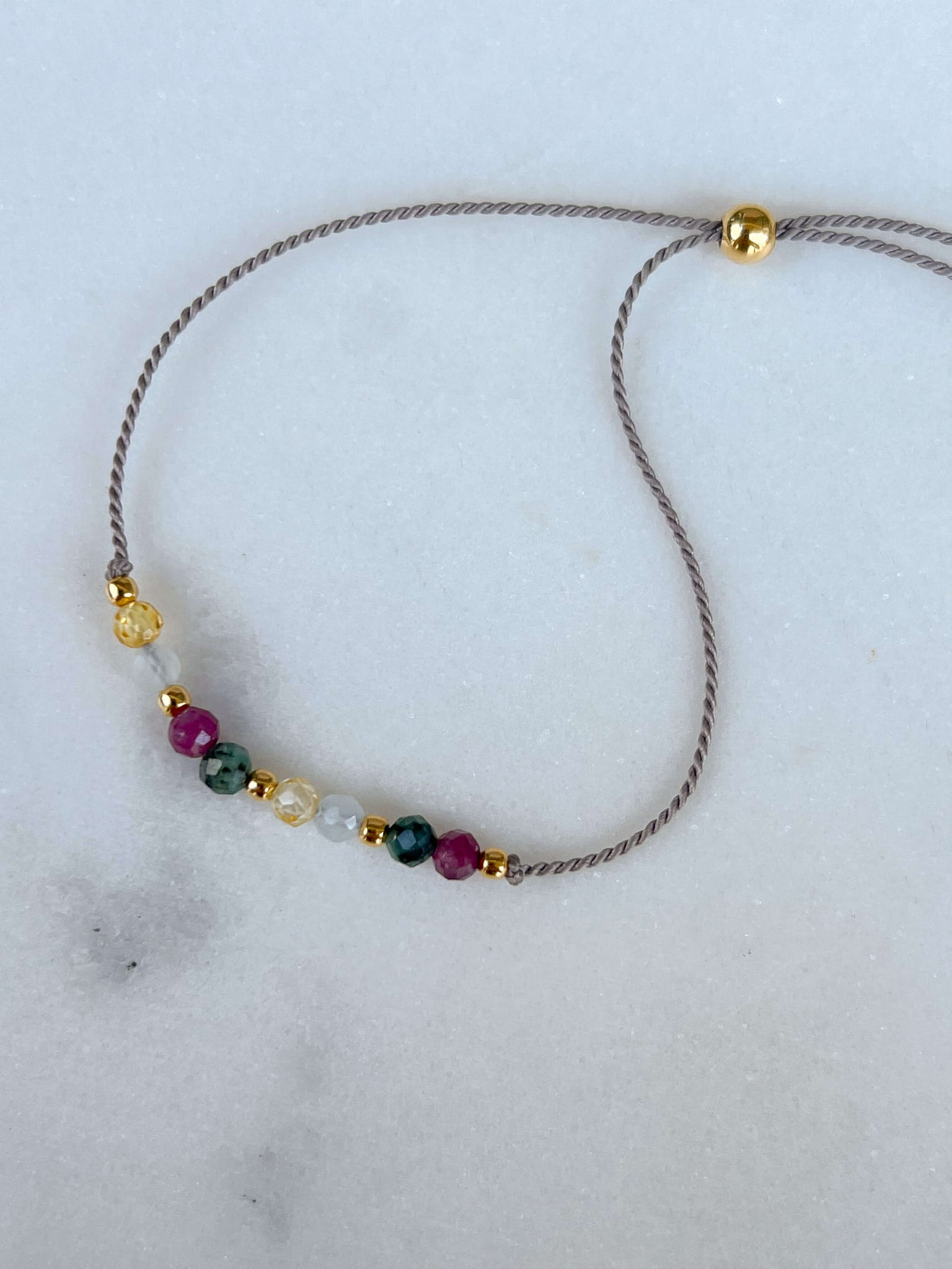 Bransoletka wykonana jest z naturalnych kamieni turmalinów, w otoczeniu srebrnych kuleczek, pozłacanych 24-karatowym złotem. Całość nawleczona na jedwabną nić w kolorze szarym. Każda bransoletka na nici posiada srebrny, pozłacany stoper, który zapewnia regulację (od 6 do 24 cm) i możliwość dopasowanie bransoletki idealnie do każdego nadgarstka.