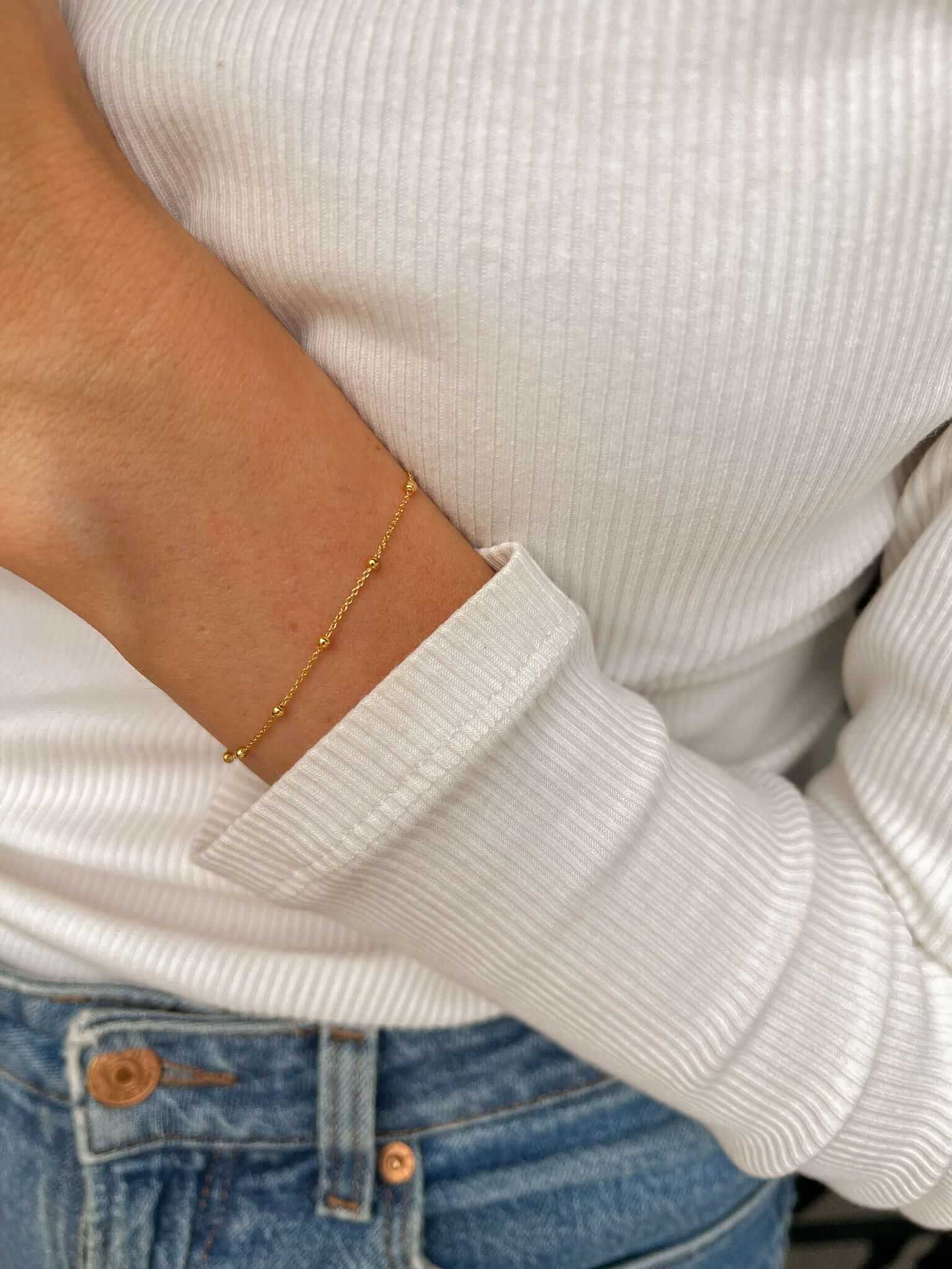 Minimalistyczna bransoletka łańcuszek z kuleczkami, wykonany z pozłacanego srebra.