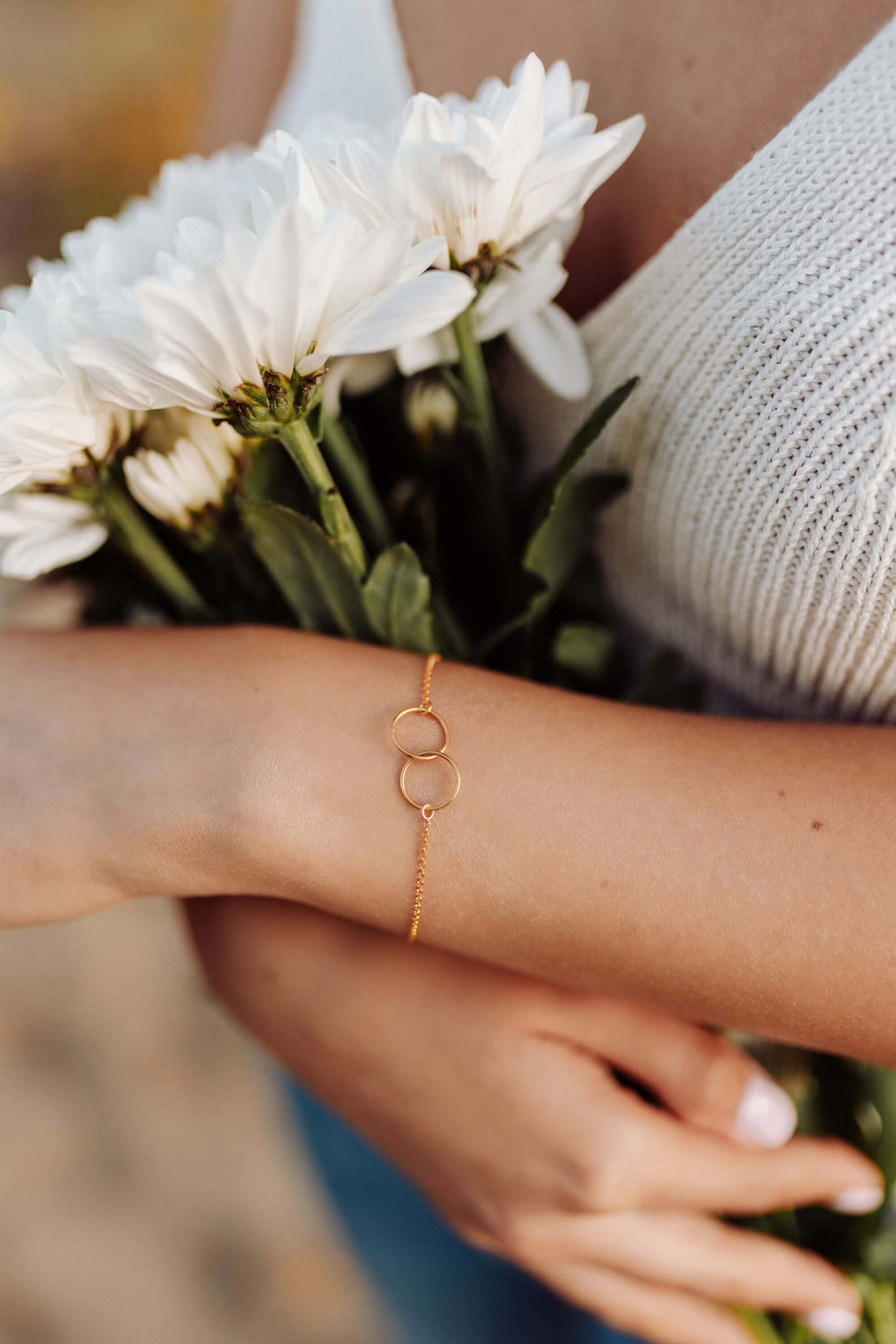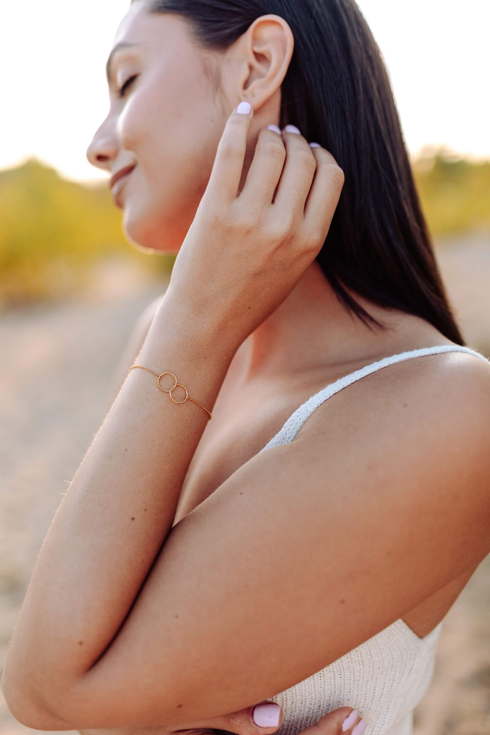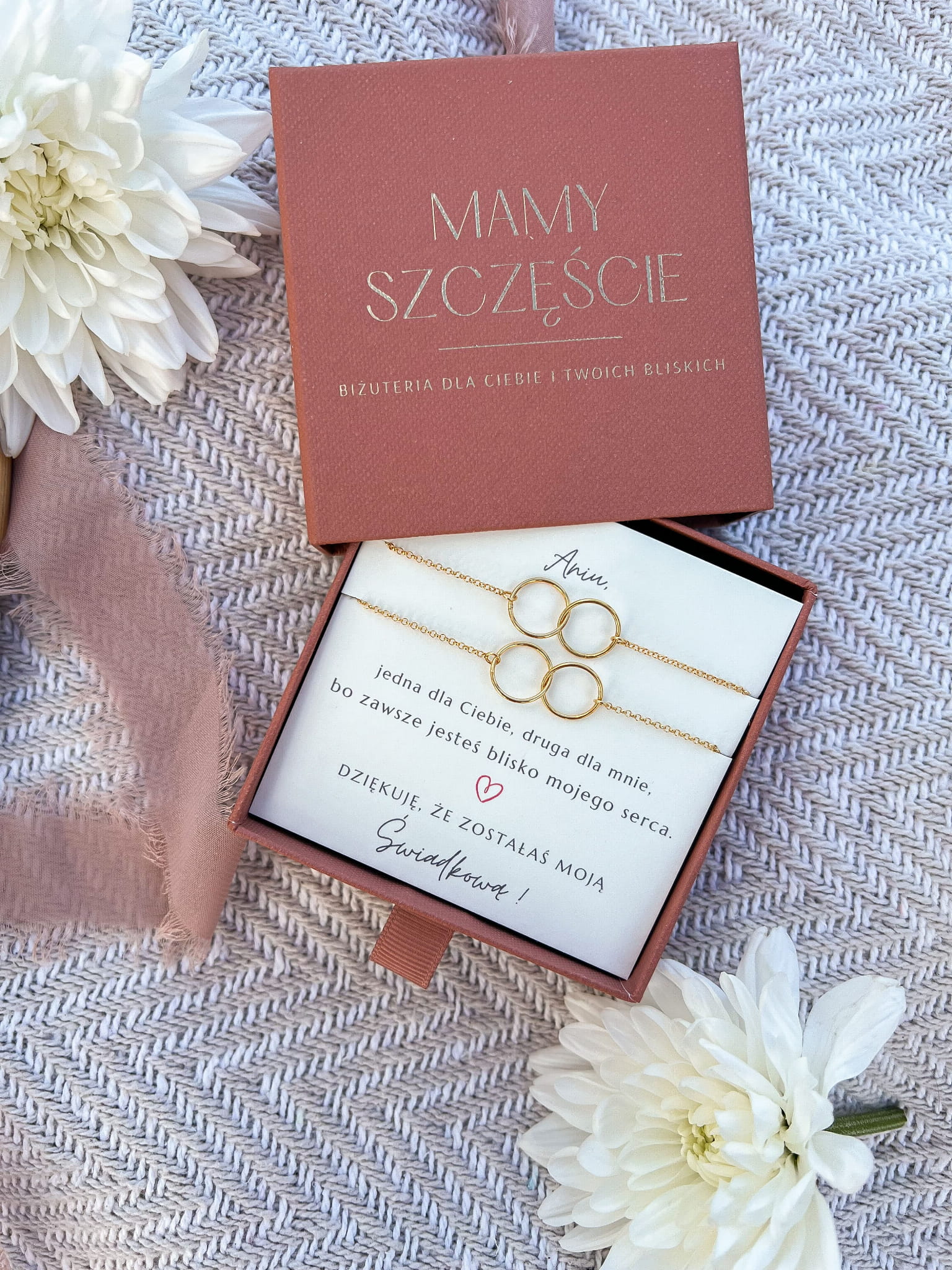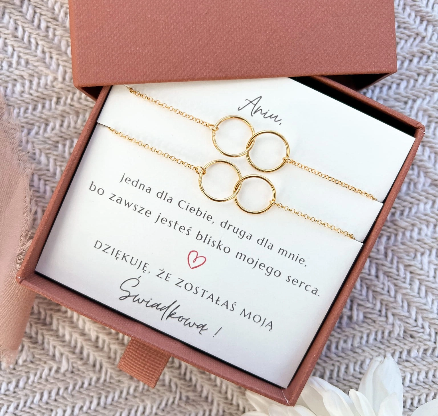 Bransoletki dla Świadkowej Circle of Love dwa połączone kółka na łańcuszku, matchy-matchy, srebrne pozłacane I Podziękowanie za świadkowanie I Jedna dla Ciebie druga dla mnie