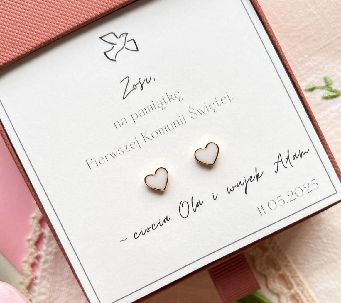 Kolczyki Serduszka białe, srebrne złocone 24k I Wyjątkowy personalizowany prezent dla dziewczynki na Komunię Świętą