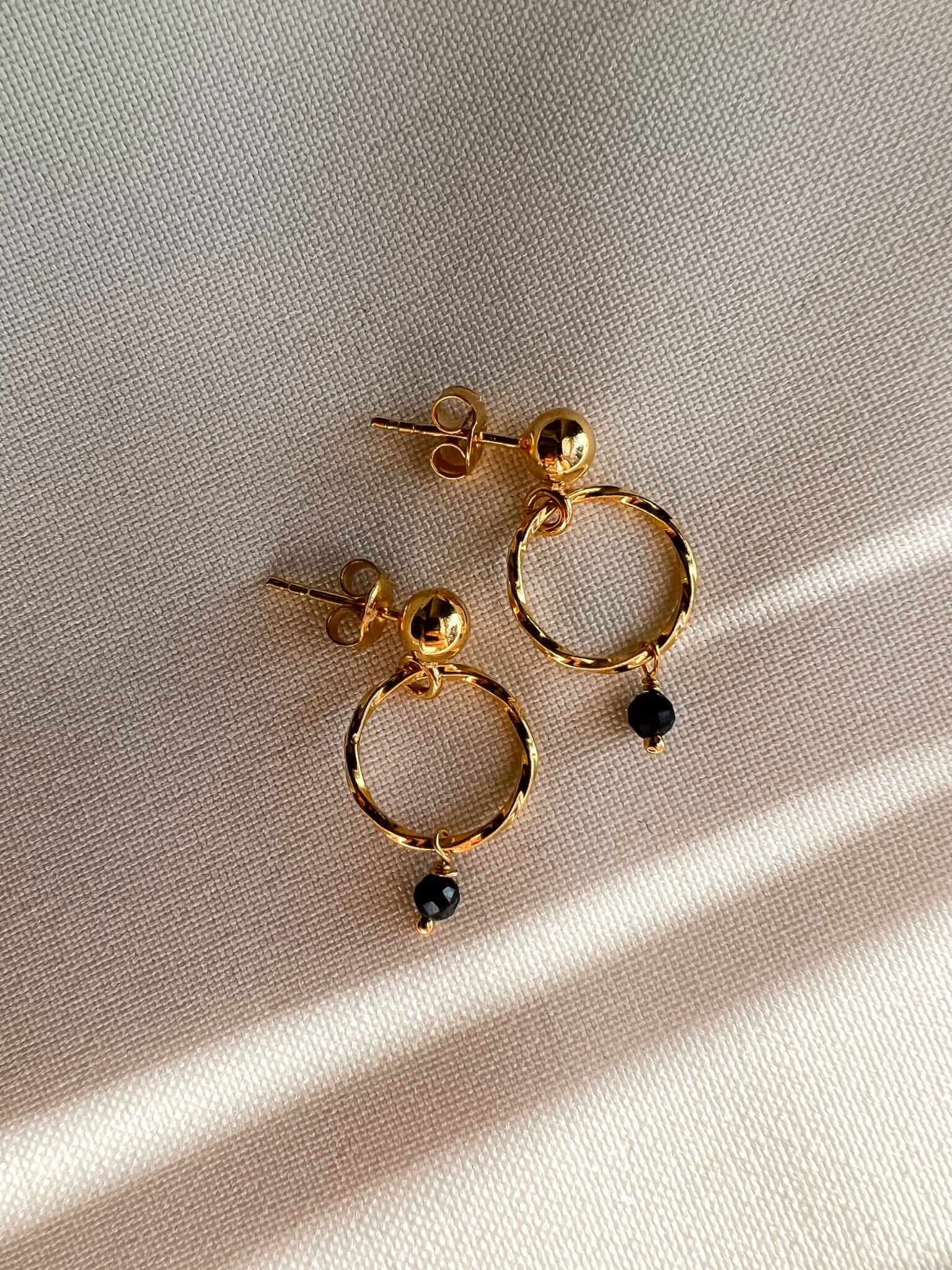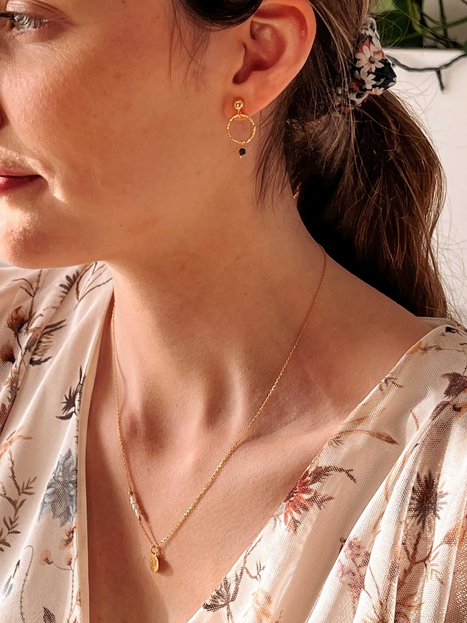 Kolczyki wiszące srebrne, pokryte 24 karatowym złotem. Na ozdobnych kółeczkach znajdują się zawieszki z naturalnym kamieniem szafiru.
