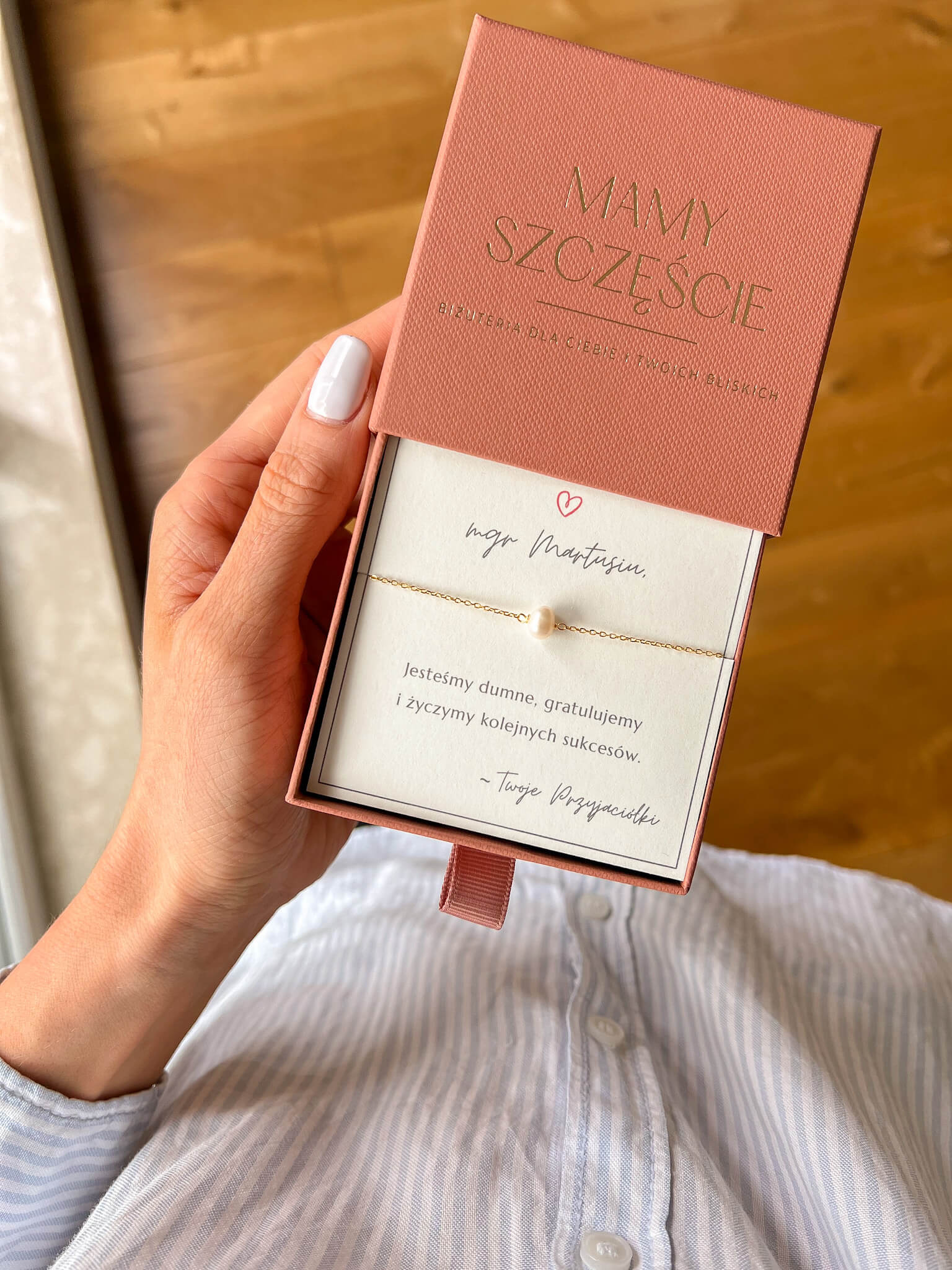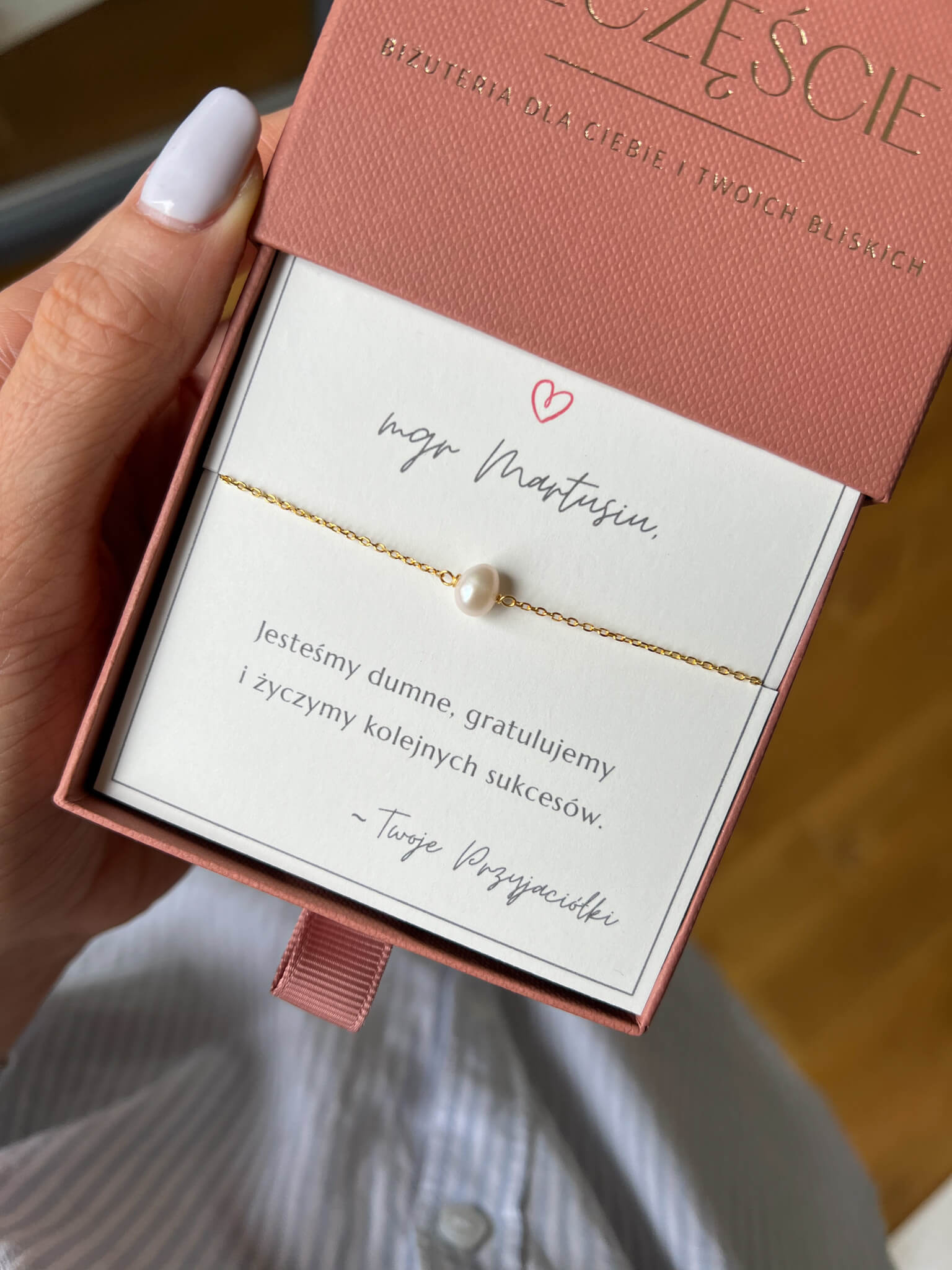 Naszyjnik z perełką połączony z dedykacją to doskonały pomysł na prezent z okazji obrony pracy magisterskiej, inżynierskiej czy licencjackiej.