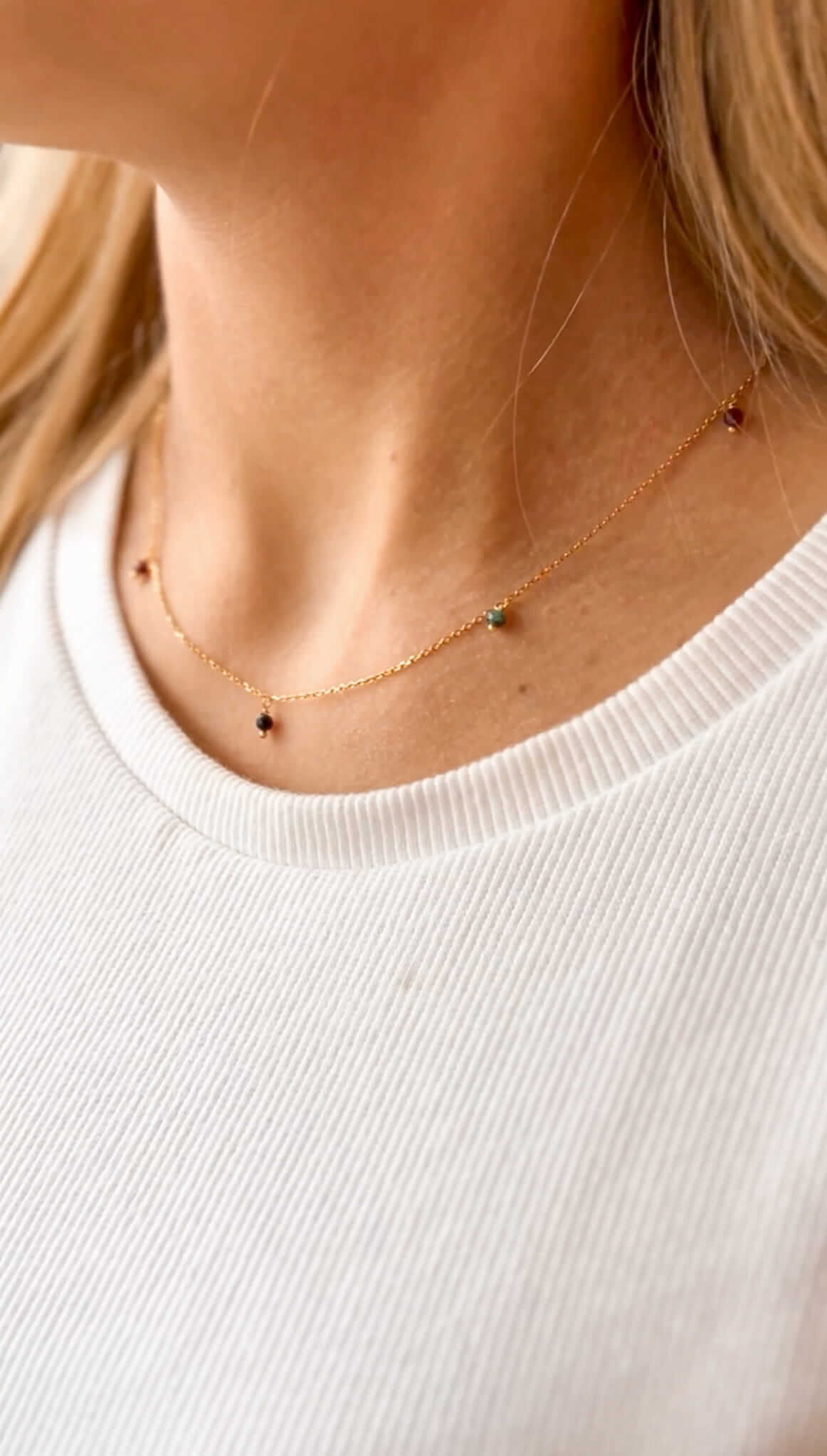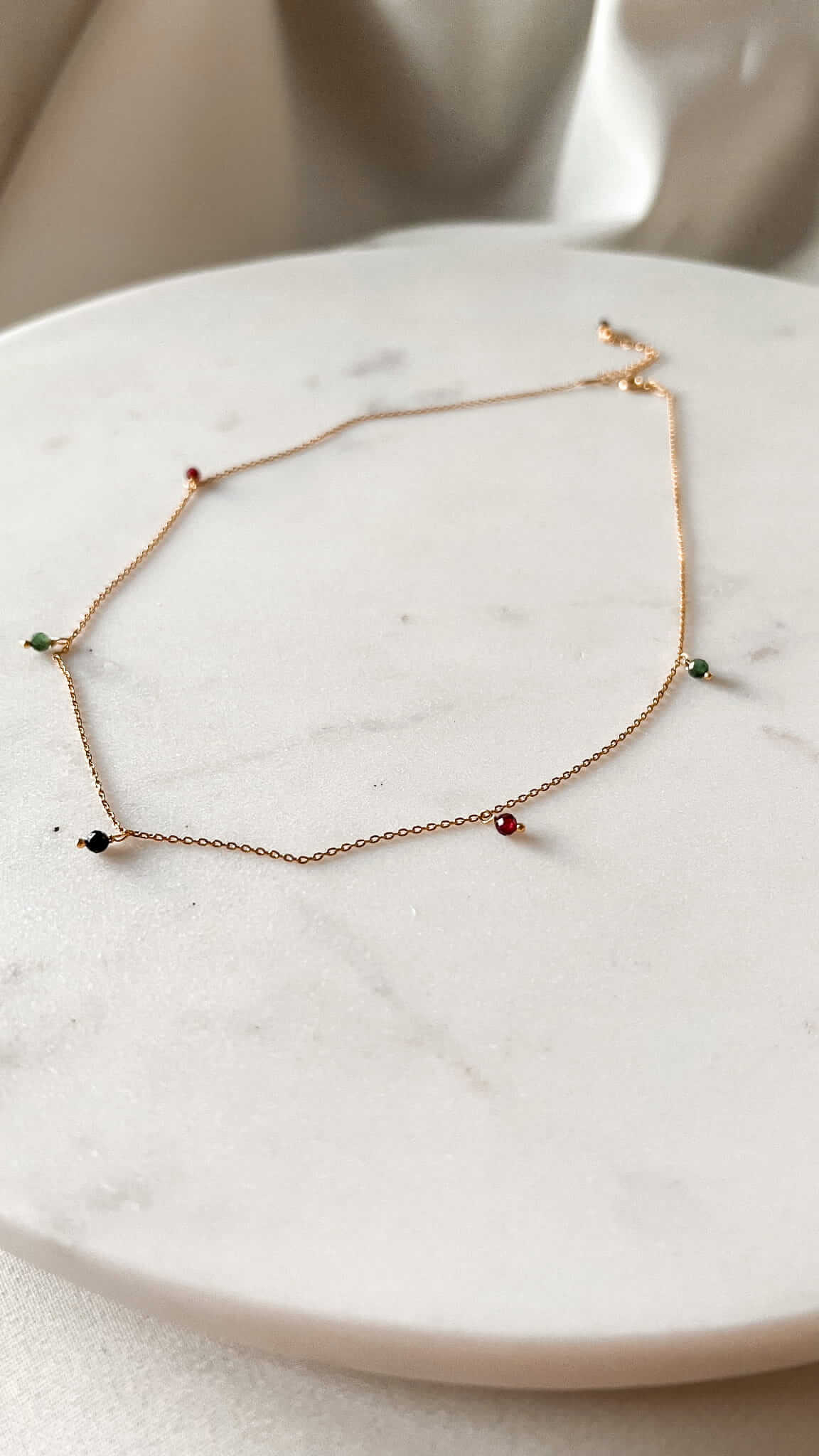 Łańcuszek wykonany ze srebra pozłacanego 24-karatowym złotem z zawieszkami w postaci kamieni szafiru, granatu i szmaragdu.