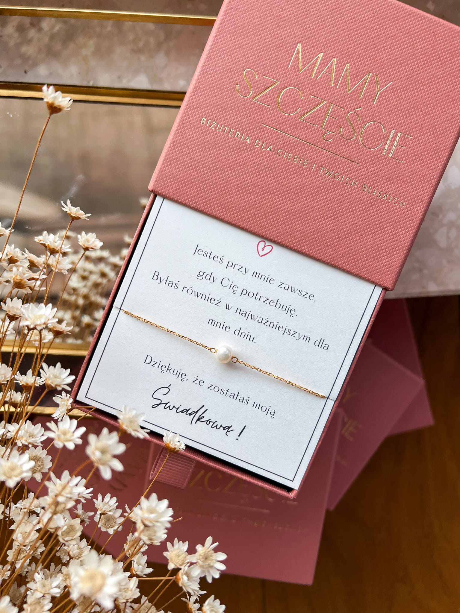 Delikatny naszyjnik „Only One” z subtelną perełką to więcej niż biżuteria – to symbol wyjątkowej relacji, jaką dzielisz ze swoją świadkową. Perła od wieków kojarzona jest z czystością intencji, kobiecą siłą i pięknem płynącym z wnętrza – tak jak Wasza przyjaźń.