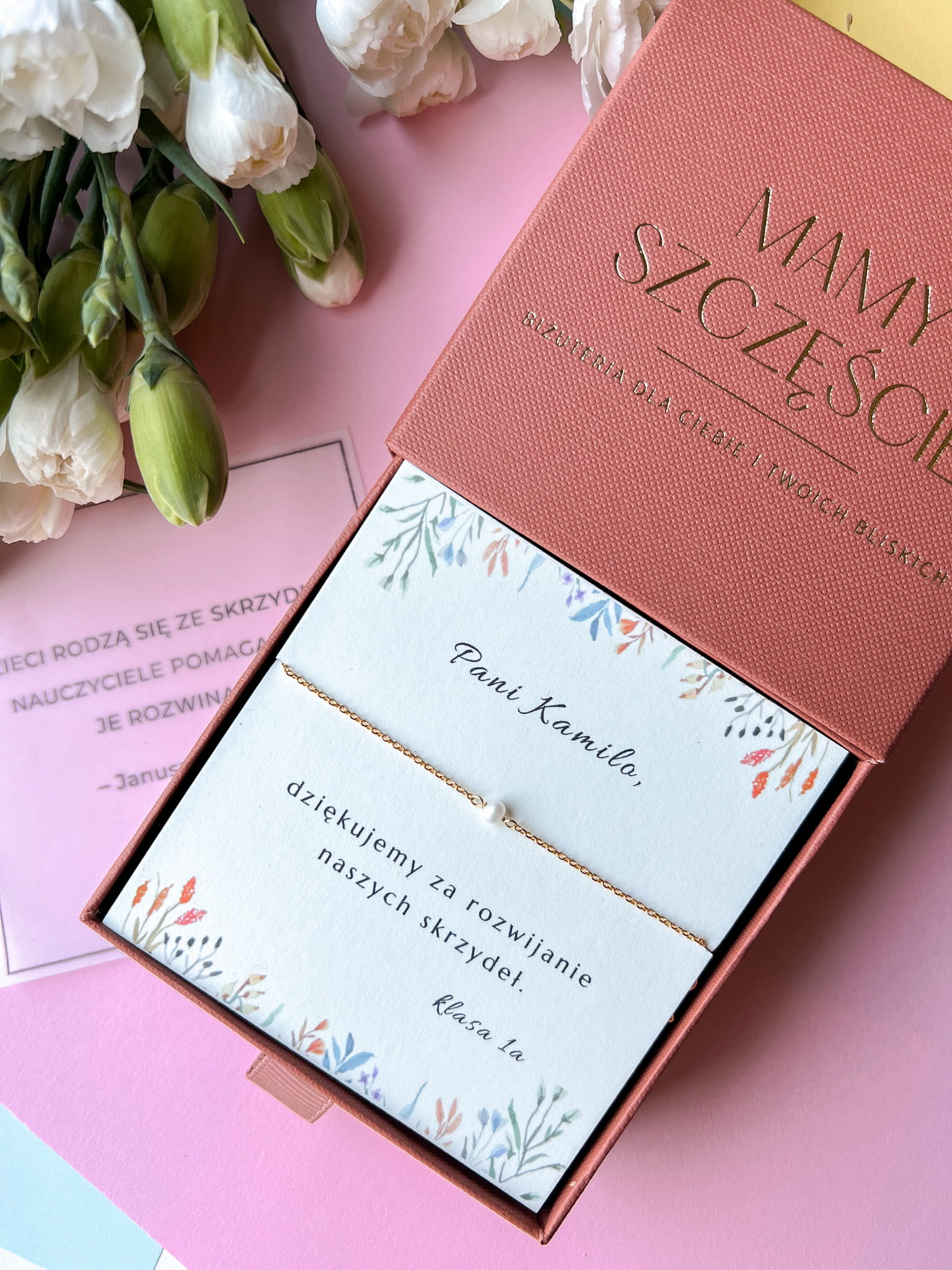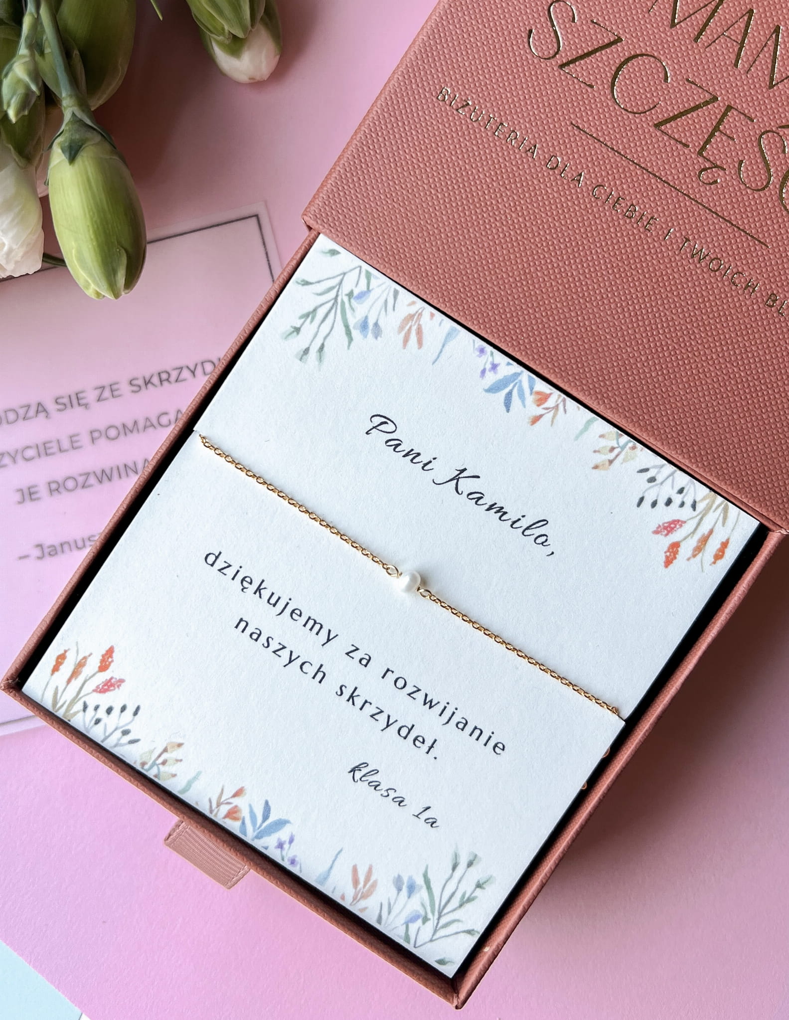 Minimalistyczna bransoletka z uroczą perełką w centrum to delikatny i elegancki dodatek, który sprawia, że każda nauczycielka poczuje się wyjątkowo. Dołącz do tego personalizowaną dedykację tworząc oryginalny prezent na dzień nauczyciela lub zakończenie roku szkolnego.