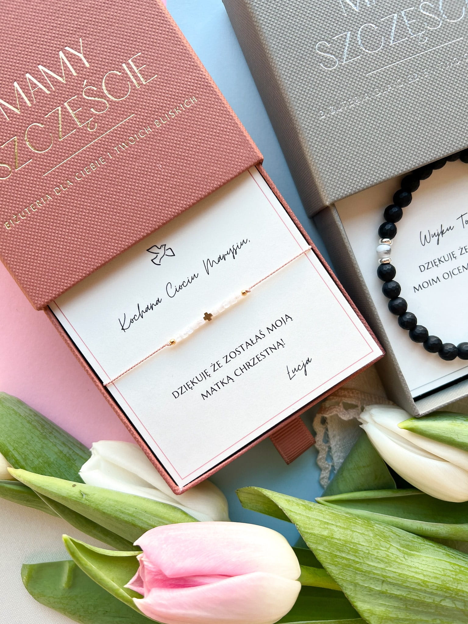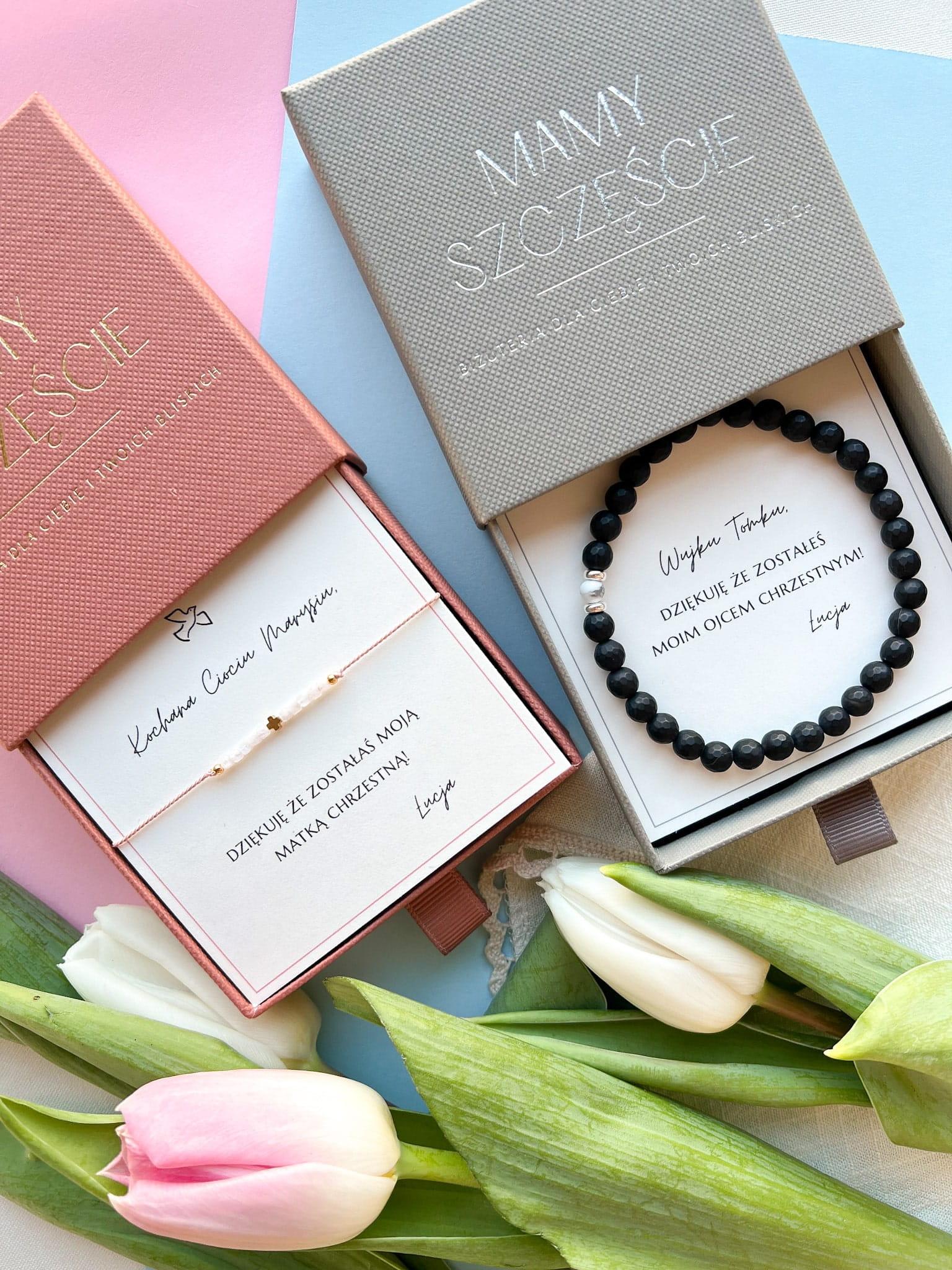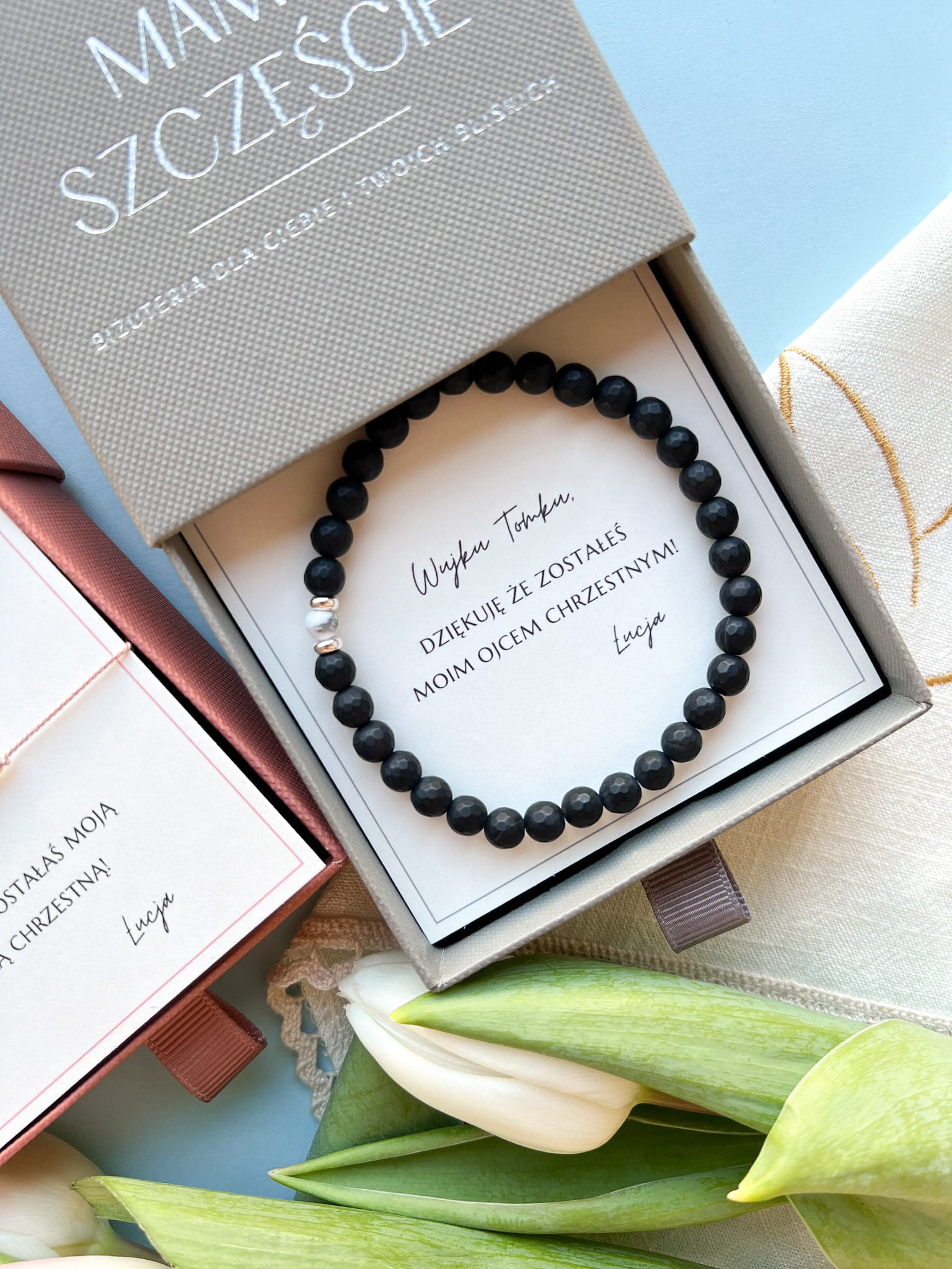 Prezenty dla Chrzestnych: męska bransoletka Onyks i bransoletka z krzyżykiem Nadzieja I Podziękowanie dla Chrzestnych na Komunię lub Chrzest