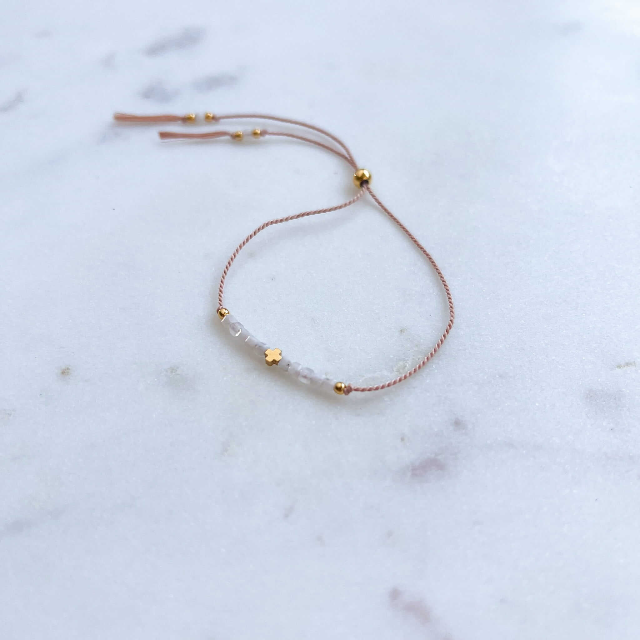 Krzyżyk wykonany z hematytu w otoczeniu białych kamieni księżycowych i srebrnych kuleczek pozłacanymi 24-karatowym złotem. Całość nawleczona na nić jedwabną w kolorze pudrowego różu, regulowaną (do 22cm) srebrnym, pozłacanym stoperem, który zapewnia możliwość dopasowanie bransoletki idealnie do każdego nadgarstka.