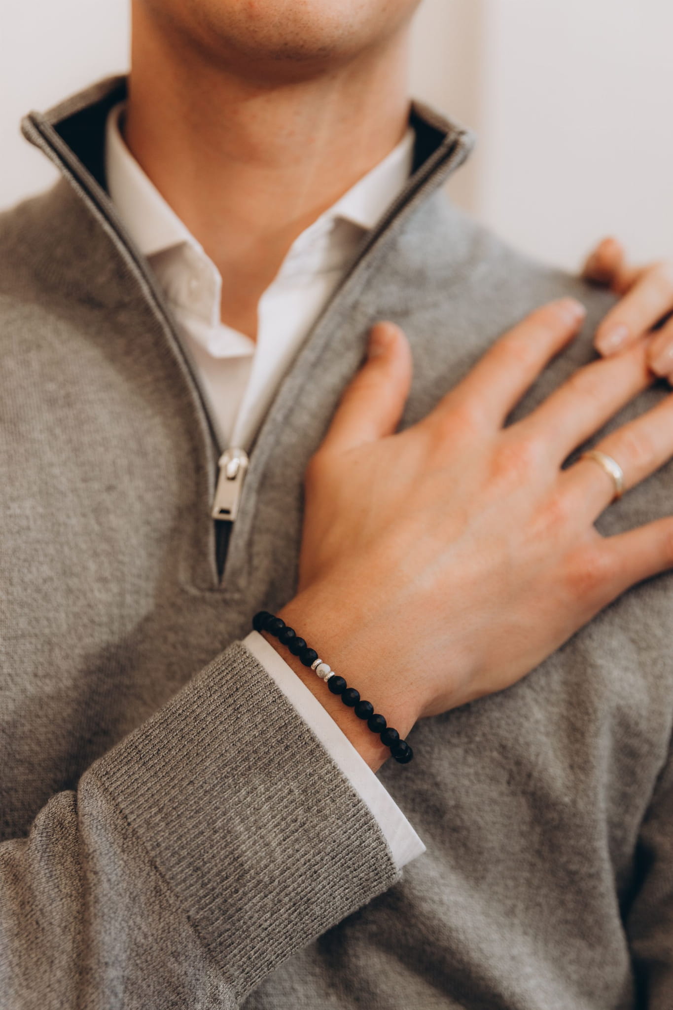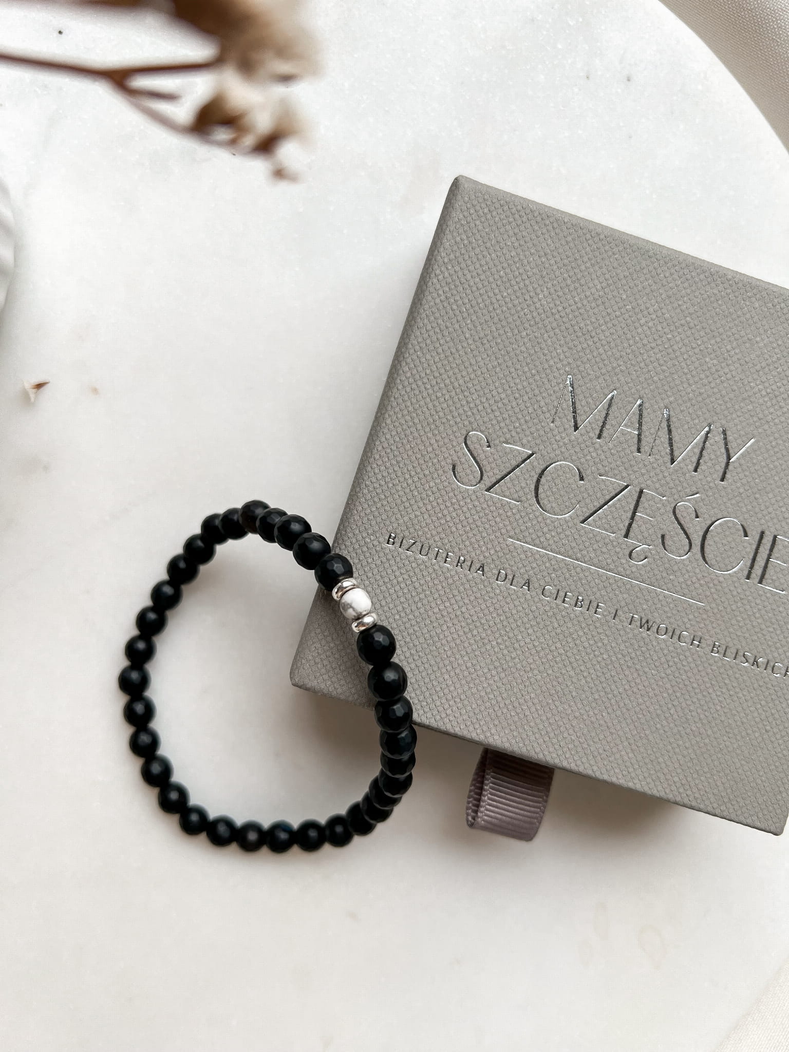 Męska bransoletka Onyks z centralnie osadzonym naturalnym kamieniem howlitu, w towarzystwie naturalnych, matowych kamieni onyksu i dodatków ze srebra 925.