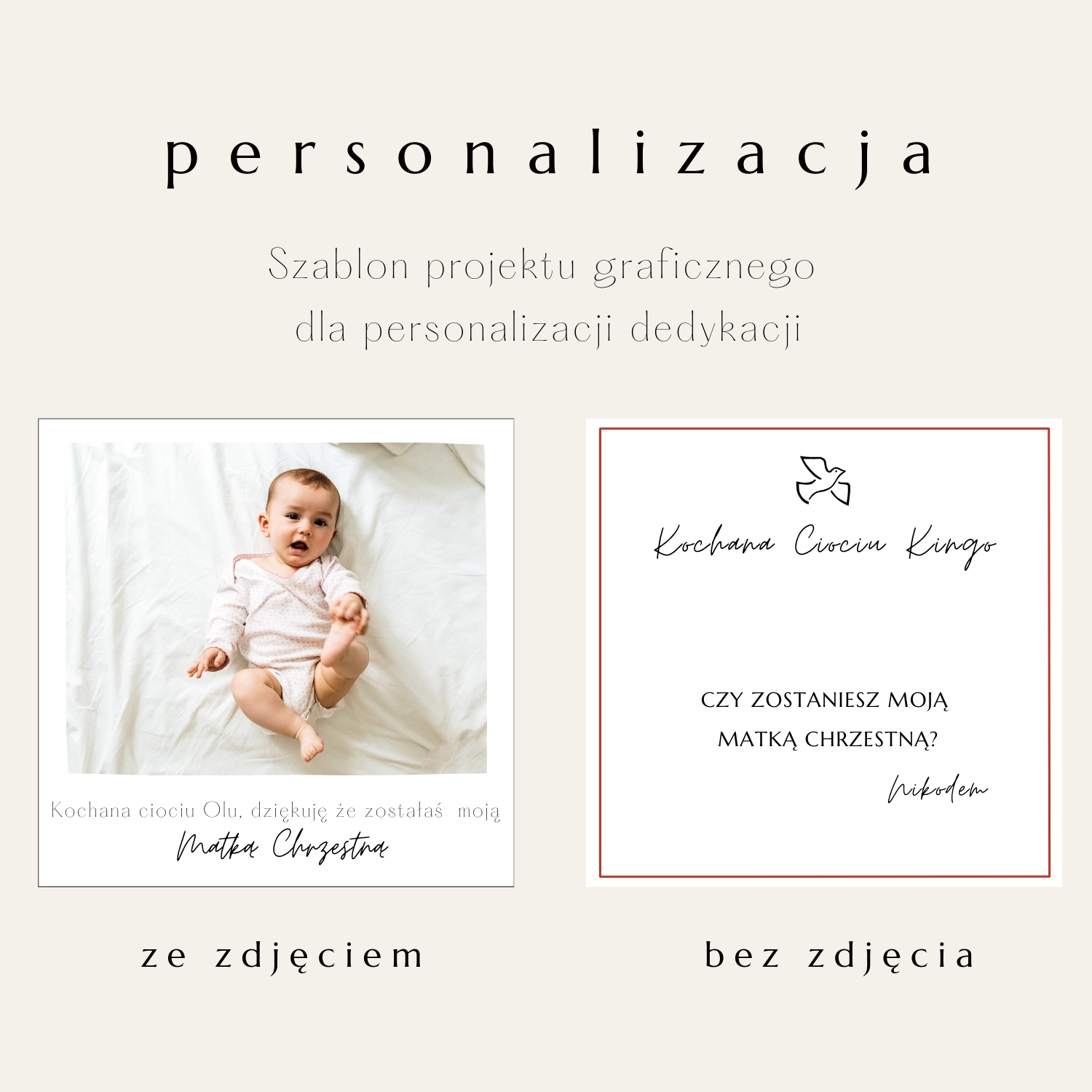 Możliwość dodania dedykacji i osobistego zdjęcia to naprawdę bardzo wyjątkowy pomysł na prezent dla Chrzestnych. Możesz dobrać dedykację, która wyrazi Twoje uczucia w najpiękniejszy sposób i dodać wybrane przez siebie, ulubione zdjęcie, tworząc tym samym pamiątkę dla bliskich na lata.
