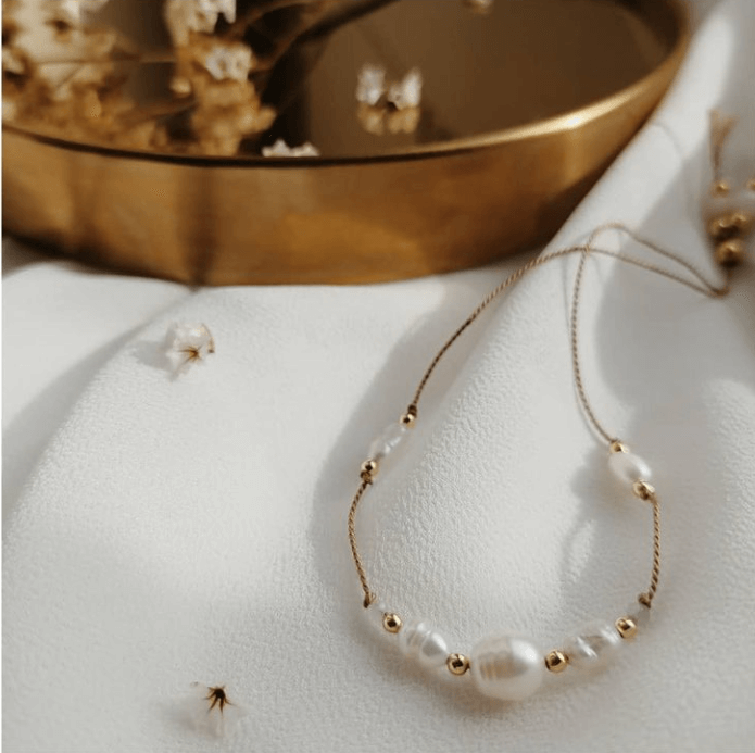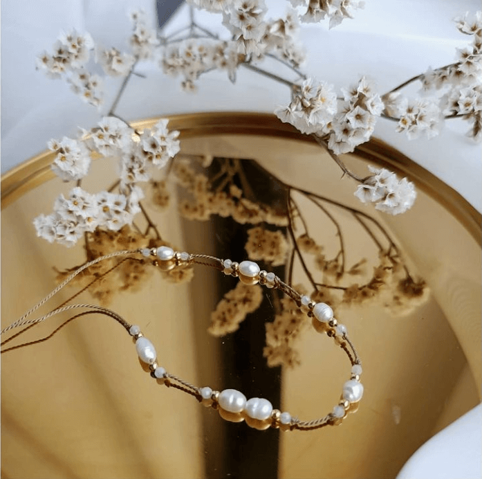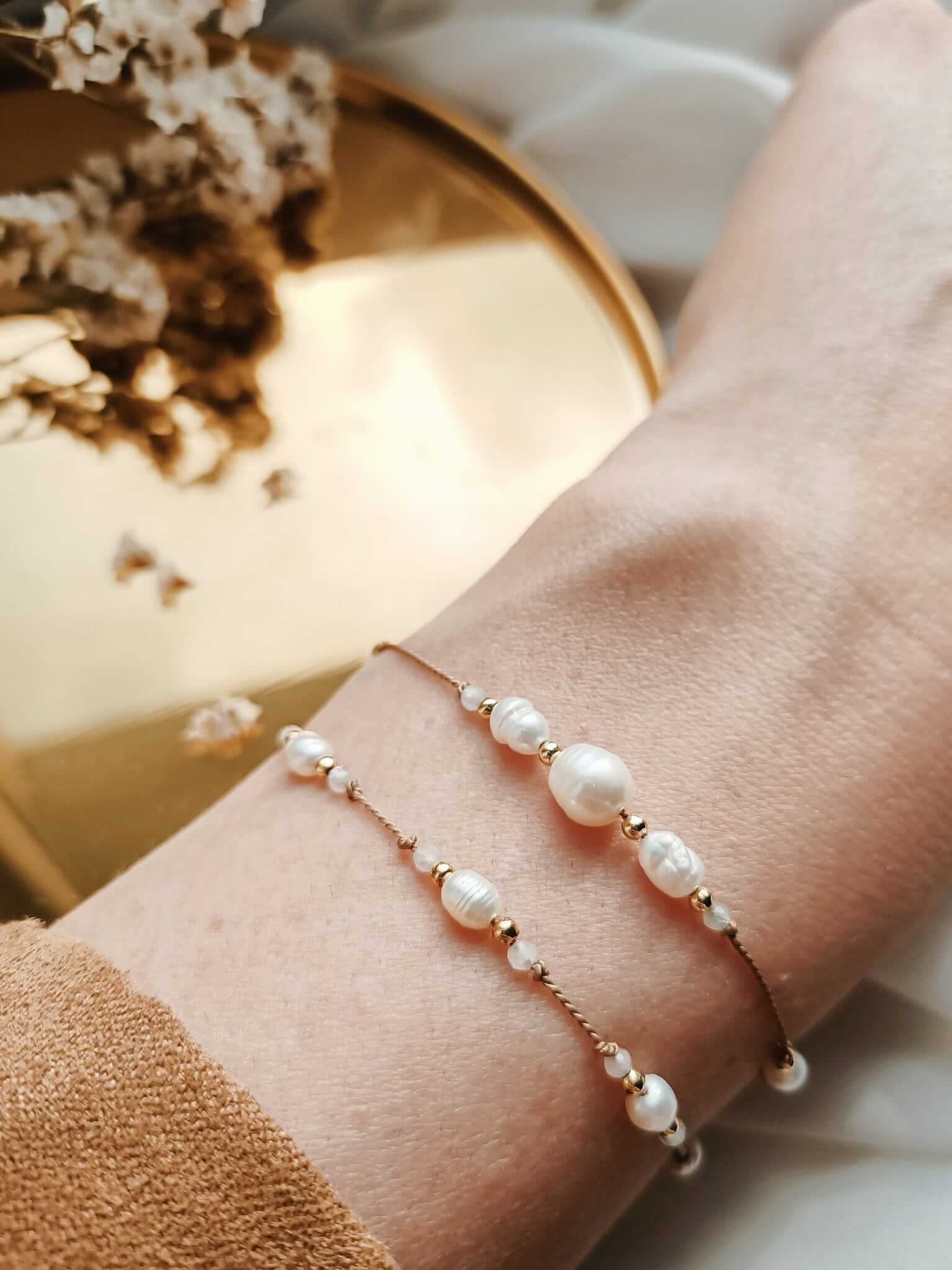 Naturalne perły słodkowodne, w towarzystwie srebrnych kuleczek pozłacanymi 24-karatowym złotem. Całość nawleczona na beżową nić jedwabną, regulowaną (do 24cm) srebrnym, pozłacanym stoperem, który zapewnia możliwość dopasowanie bransoletki idealnie do każdego nadgarstka.