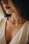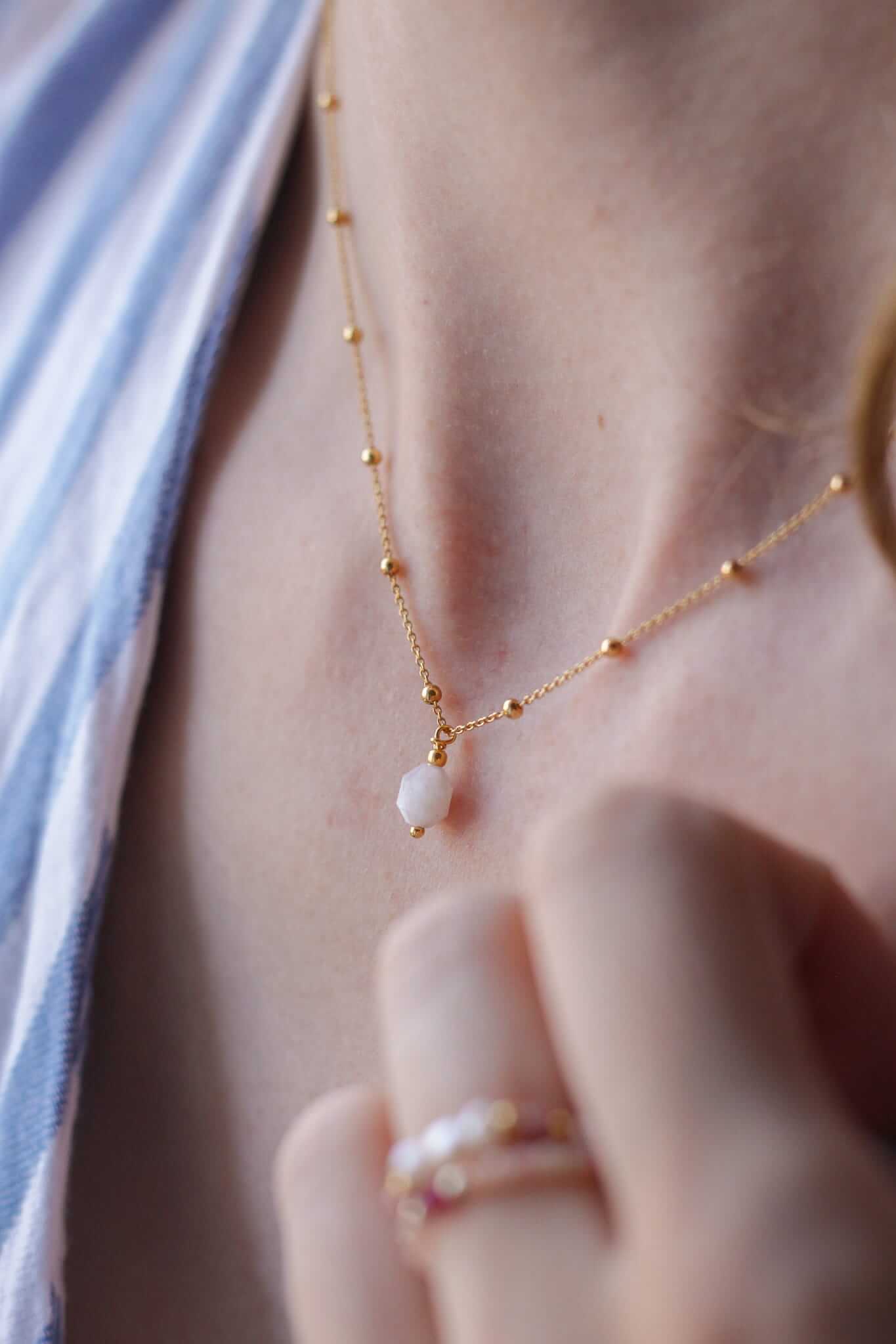 Drugi naszyjnik to modny, złocony 24-karatowym złotem łańcuszek z kuleczkami połączony z zawieszką w postaci naturalnego kamienia księżycowego.